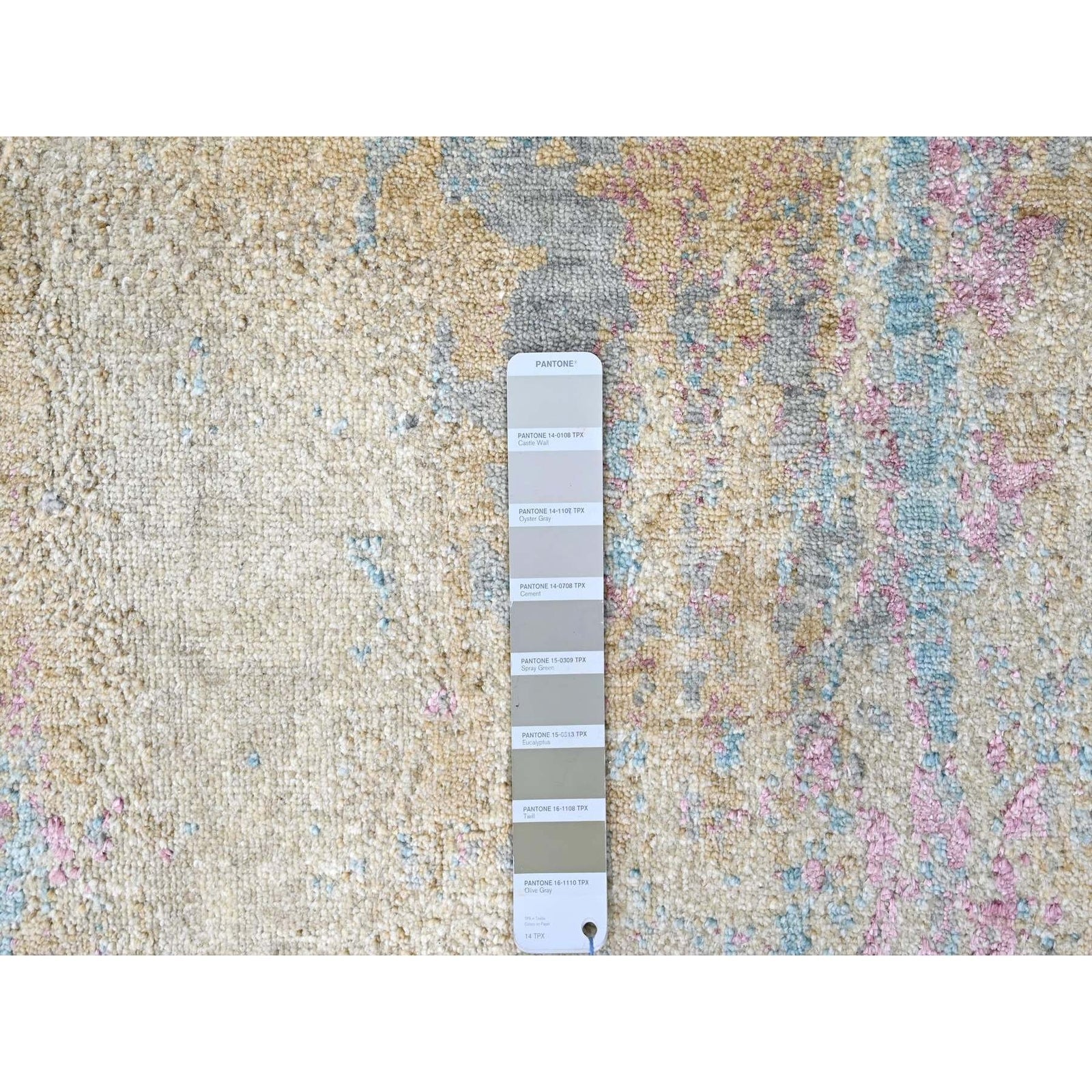 9'X12' Pastel Yellow Abstract Design Wool And Silk Shiny Hand Knotted Rug