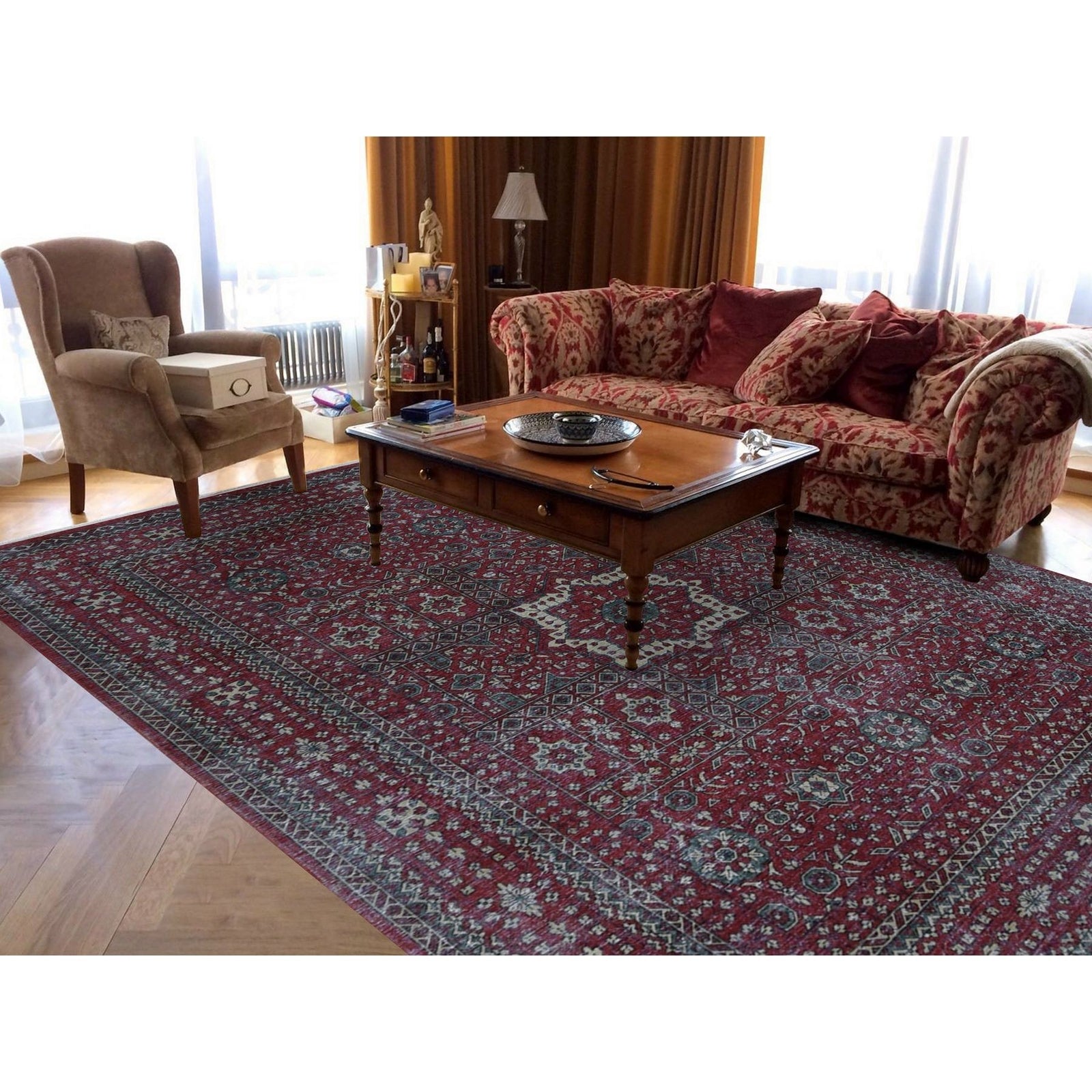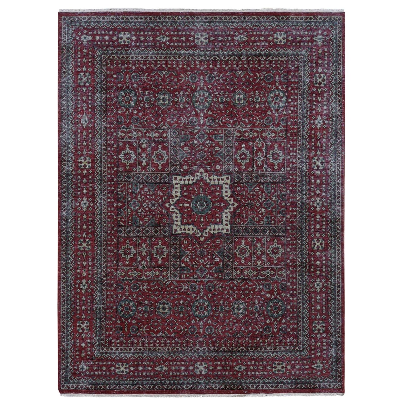 9'X12' Red Vintage Look Mamluk Worn Wool Hand Knotted Rug