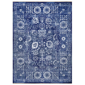 9'X12' Yale Blue Hand Knotted Tebraz With Leaf Motifs Wool And Silk Rug