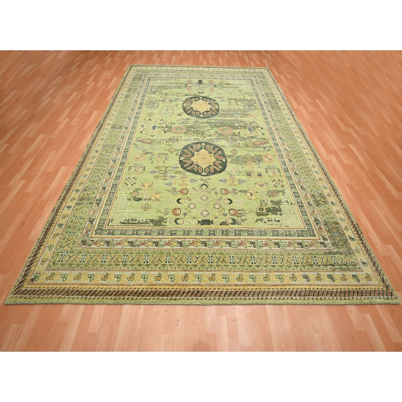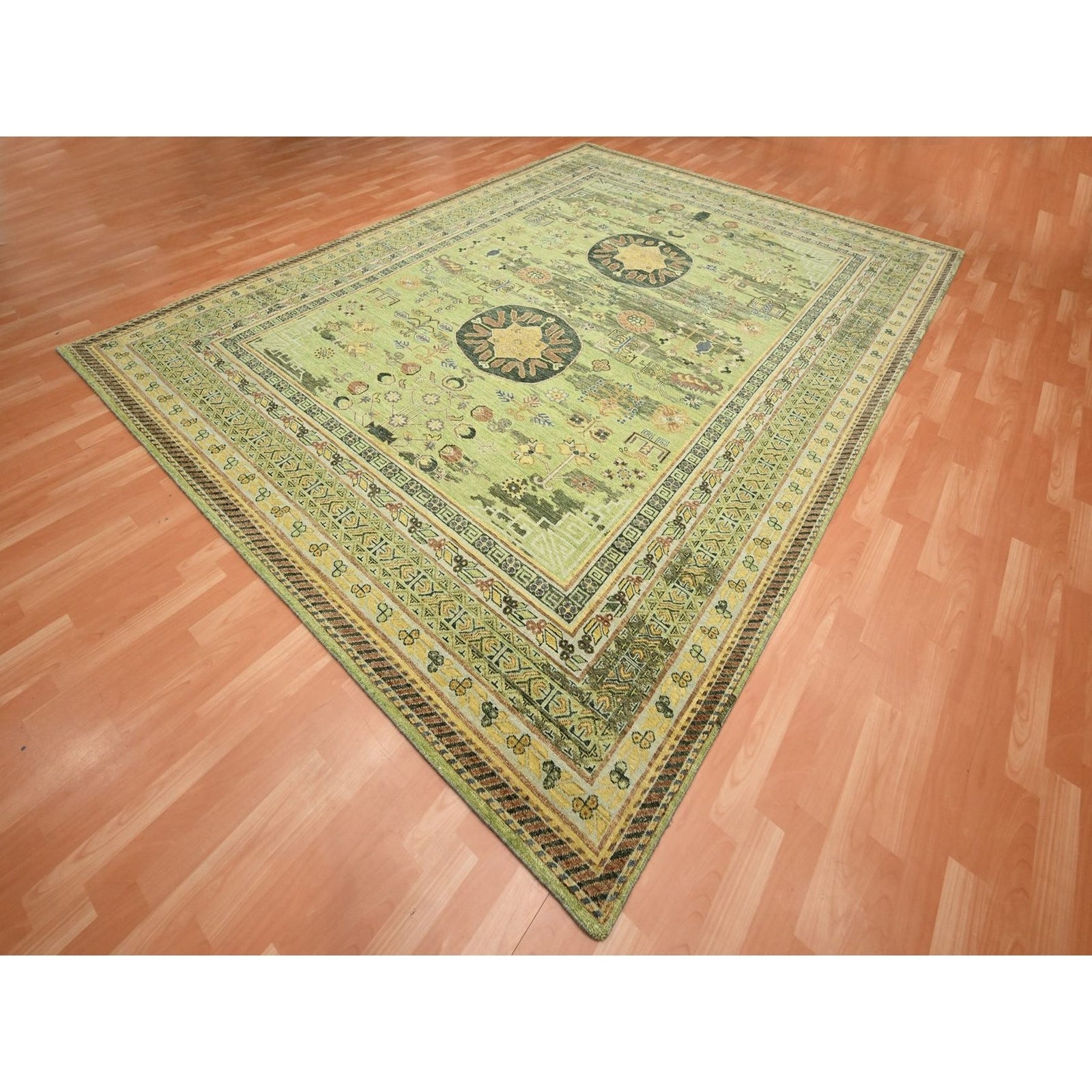 9'X12'1" Shades Of Green Khotan Design Wool Shaved Low Hand Knotted Rug