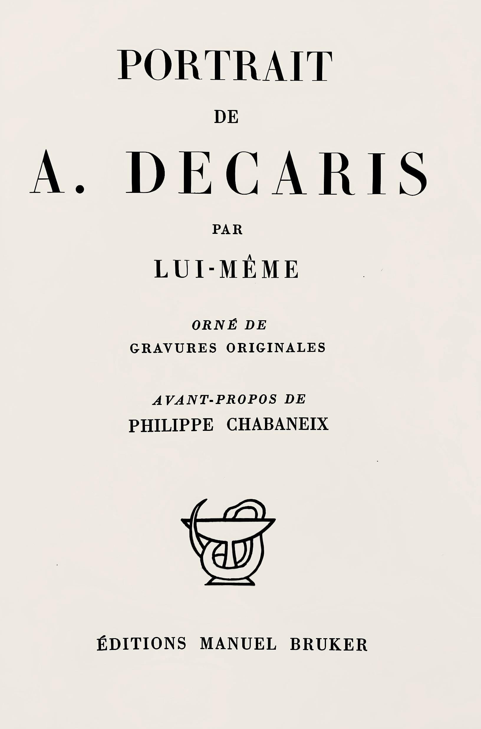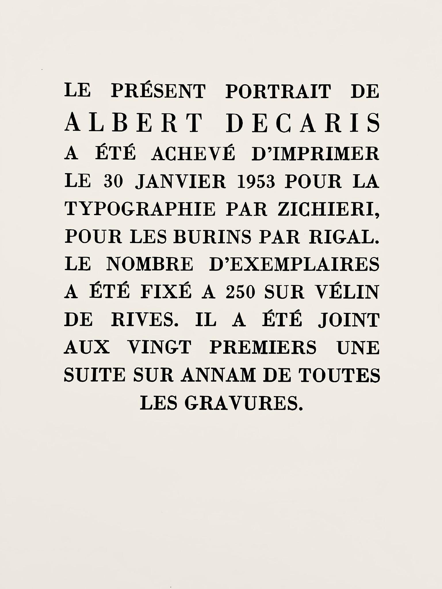 Excerpted from the volume (translated from French), The present portrait of Albert Decaris was completed to print on January 30, 1953 for typography by Zichieri; for engraving by Rigal.