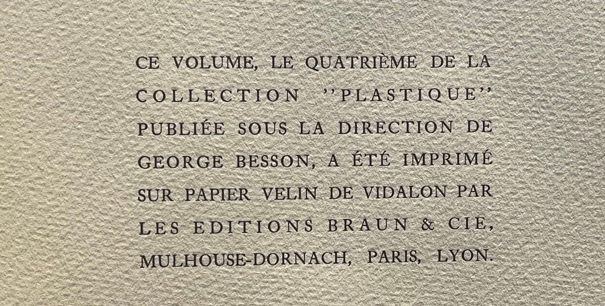Published by George Besson, Paris; printed by Les ditions Braun & Cie, Mulhouse-Dornach, Paris, Lyon. Excerpted from the album (translated from French), This album, the fourth of the "Plastique" collection published under the direction of George Besson, was printed on vlin Vidalon paper by Braun & Cie, Mulhouse-Dornach, Paris, Lyon.
