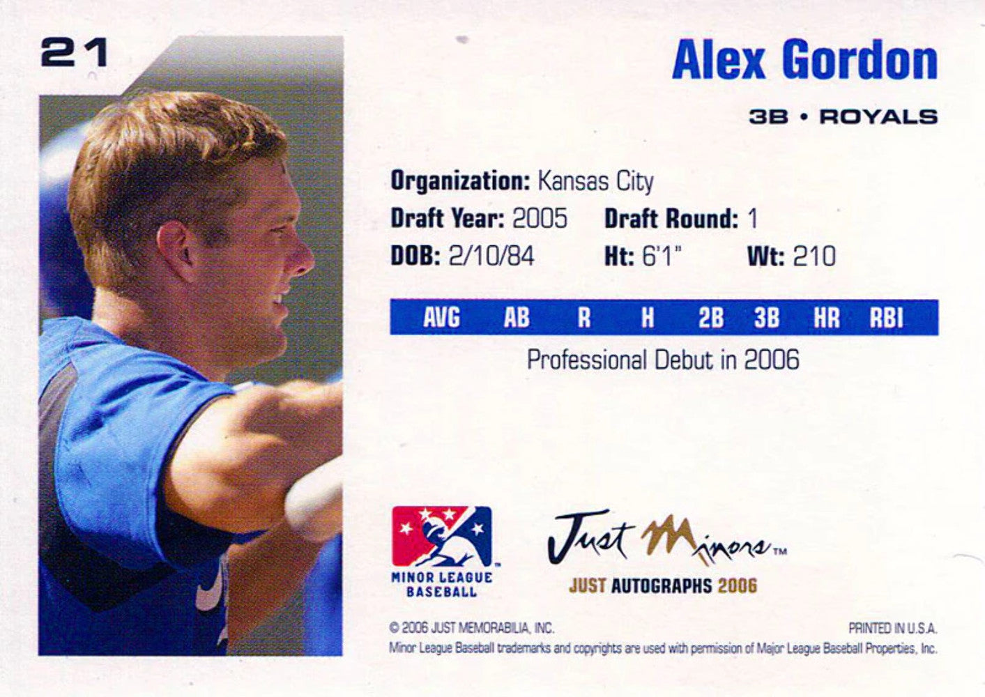 Alex Gordon Autographed 2006 Just Minors Rookie Card