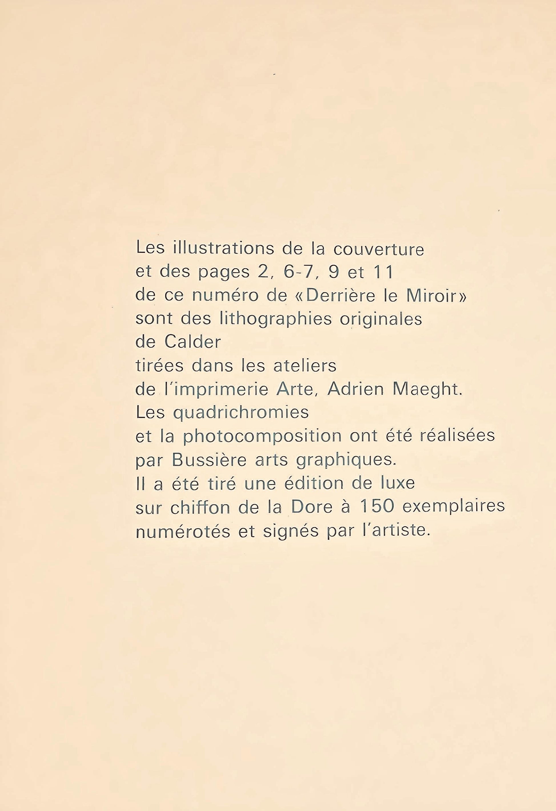Excerpted from the volume (translated from French), The illustrations on the cover and pages 2, 6-7, 9 and 11 of this issue of "Behind the Mirror" are original lithographs by Calder, drawn in ateliers de l'imprimerie Arte, Adrien Maeght.