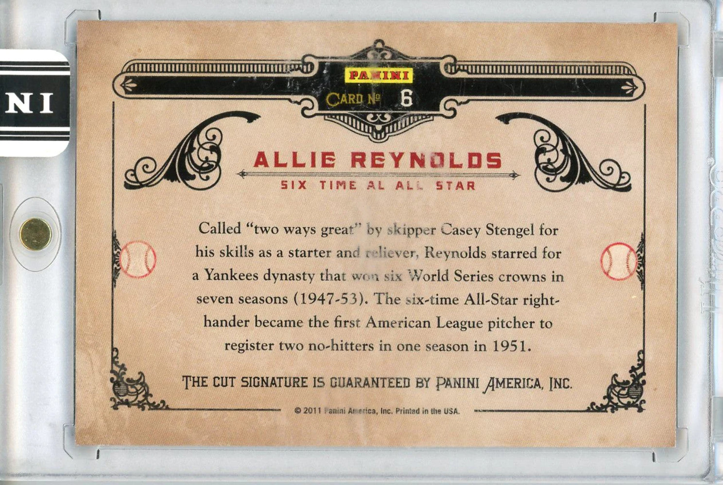 Allie Reynolds Autographed 2011 Donruss Limited Cuts Card #6