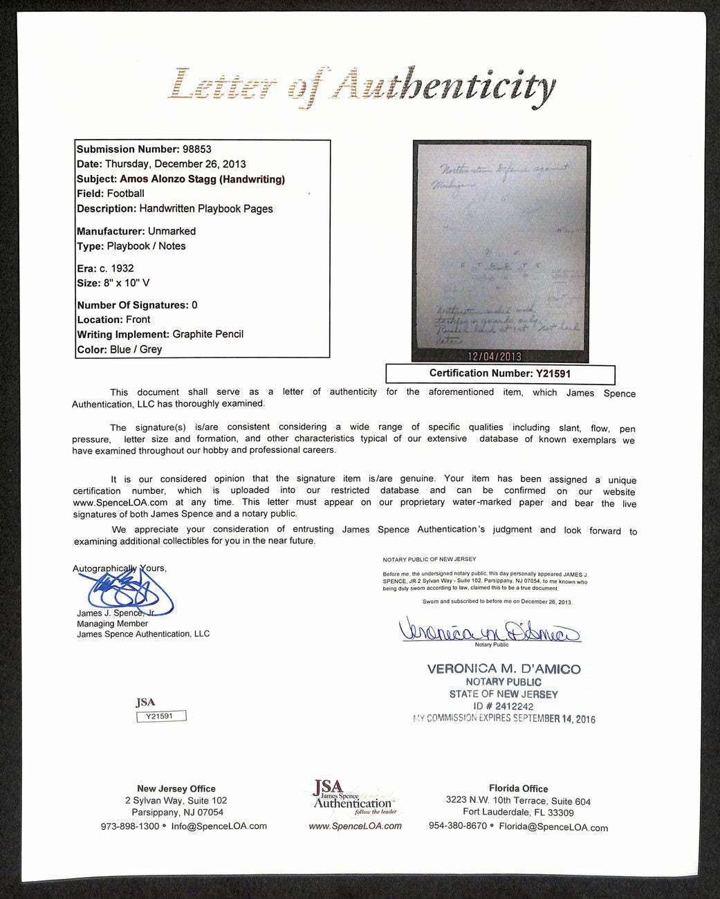 Amos Alonzo Stagg Hof 1932 Handwritten Playbook Page Very Rare Jsa 185585