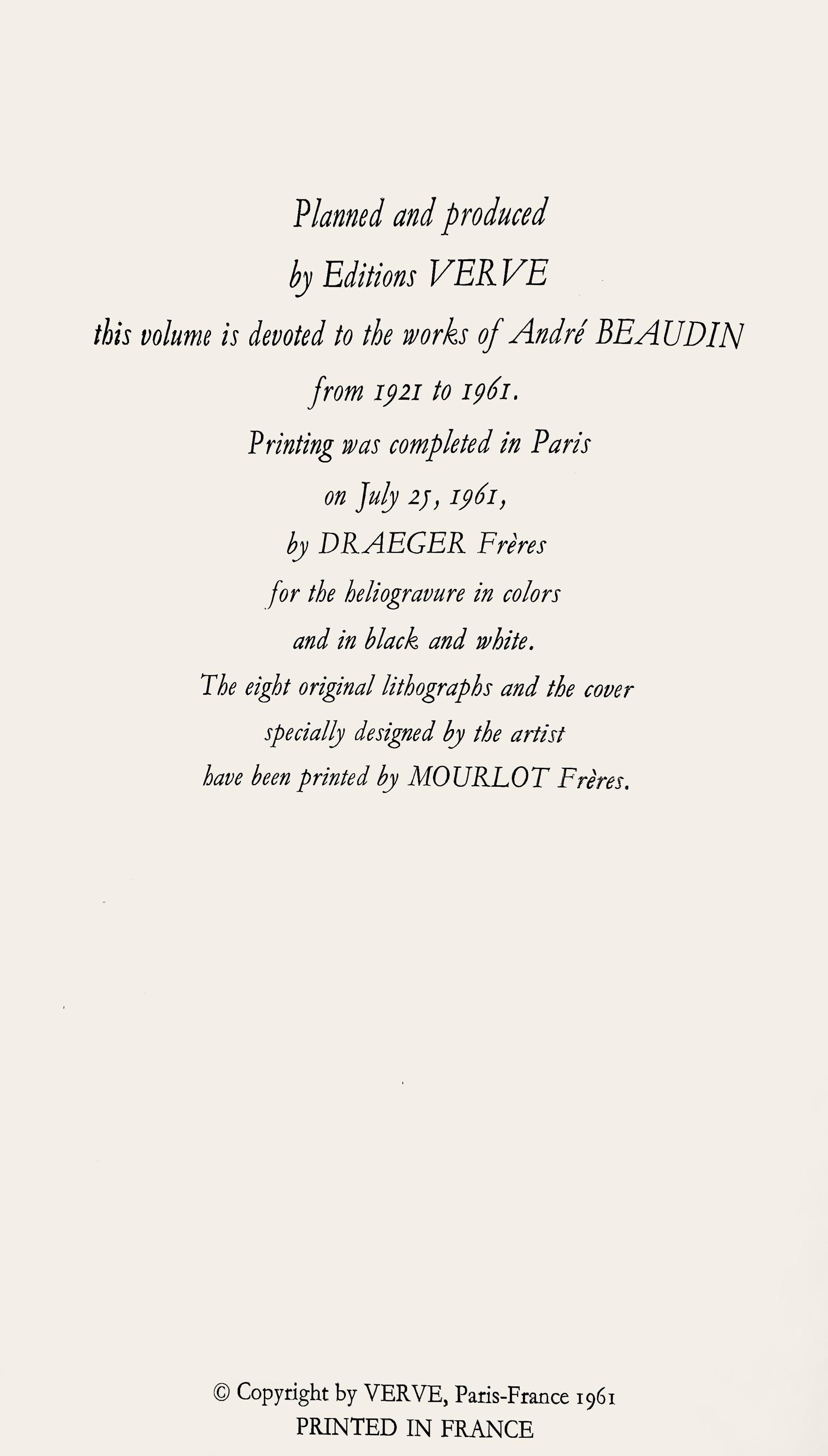 Excerpted from the volume (translated from French), Planned and produced by ditions Verve, this volume is devoted to the works of Andr Beaudin from 1921 to 1961.