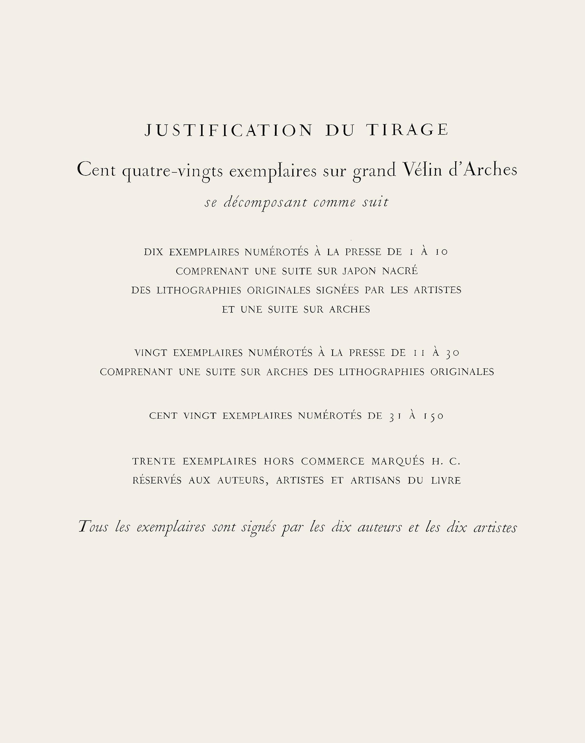 Justification of the draw; one hundred and eighty examples on a grand vlin d'Arches dcomposant as follows: ten examples, numbered to the press from 1 to 10, including a sequel on japon nacr, the original lithographies signed by the artists and a sequel on Arches; twenty examples, numbered to the press from 11 to 30, including a suite on Arches of the original lithographies; one hundred and twenty examples, numbered from 31 to 150; thirty non-trade examples, marked H.C., reserved for the authors, artists and artisans of the folio. All colophons are signed by the ten authors and the ten artists.