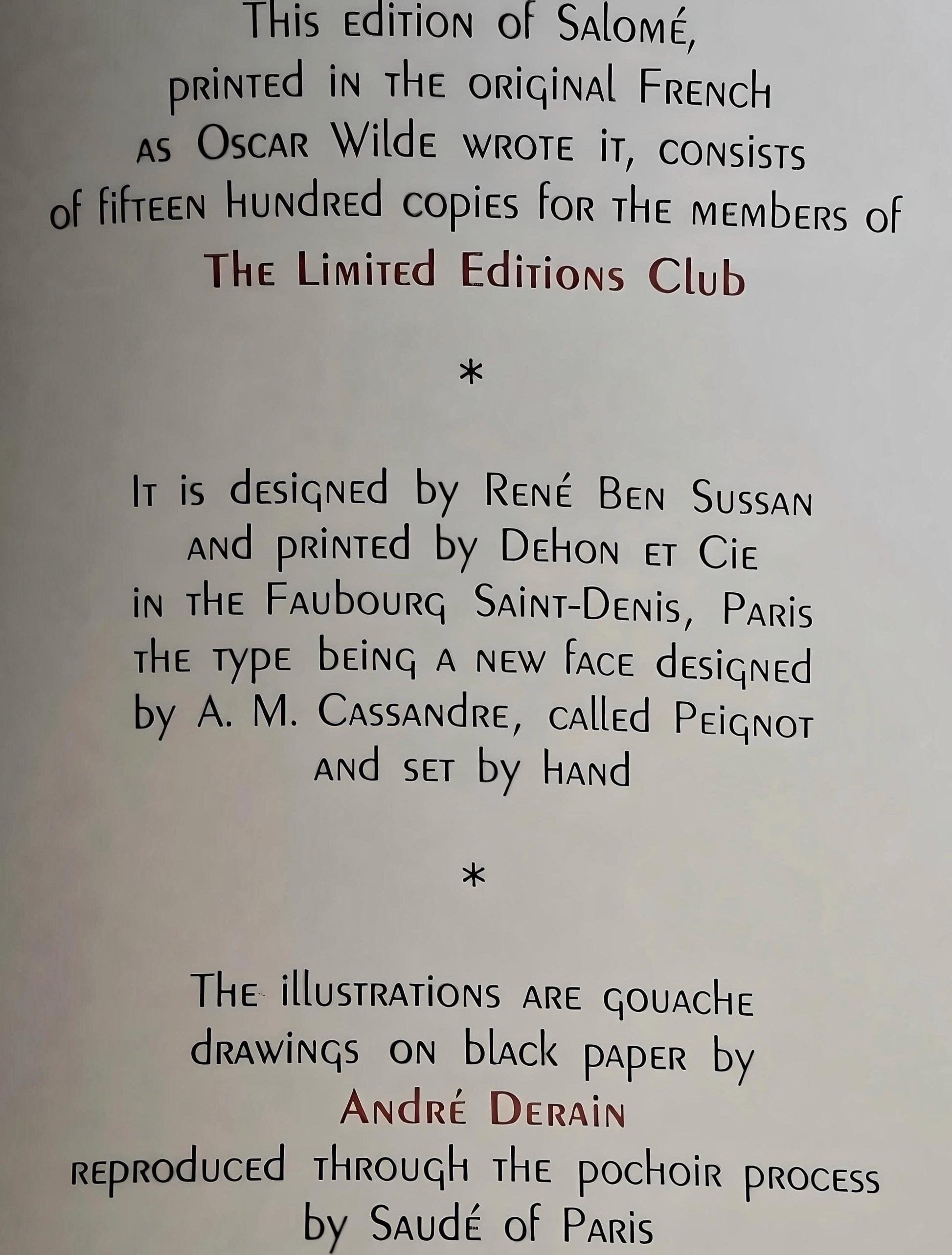 Excerpted from the album, This edition of Salom, printed in the original French as Oscar Wilde wrote it, consists of fifteen hundred copies for the members of the Limited Editions Club.