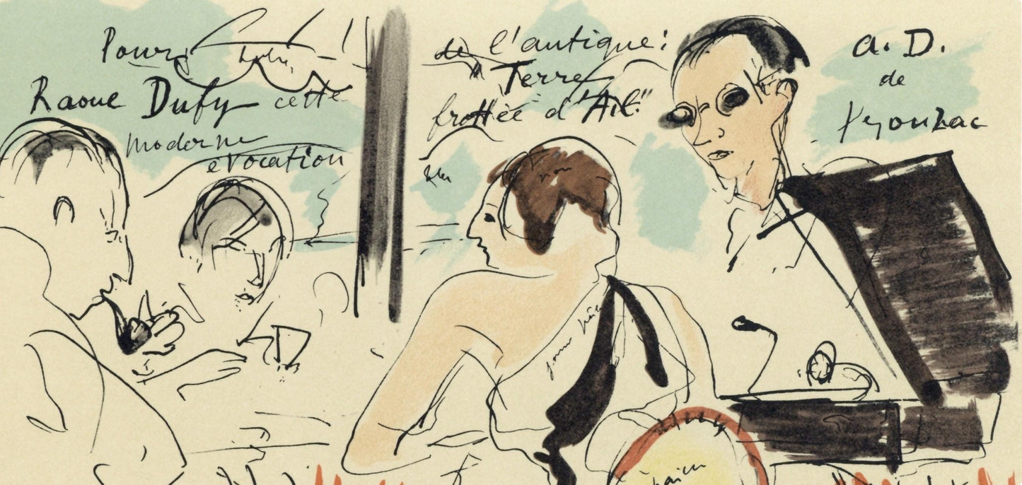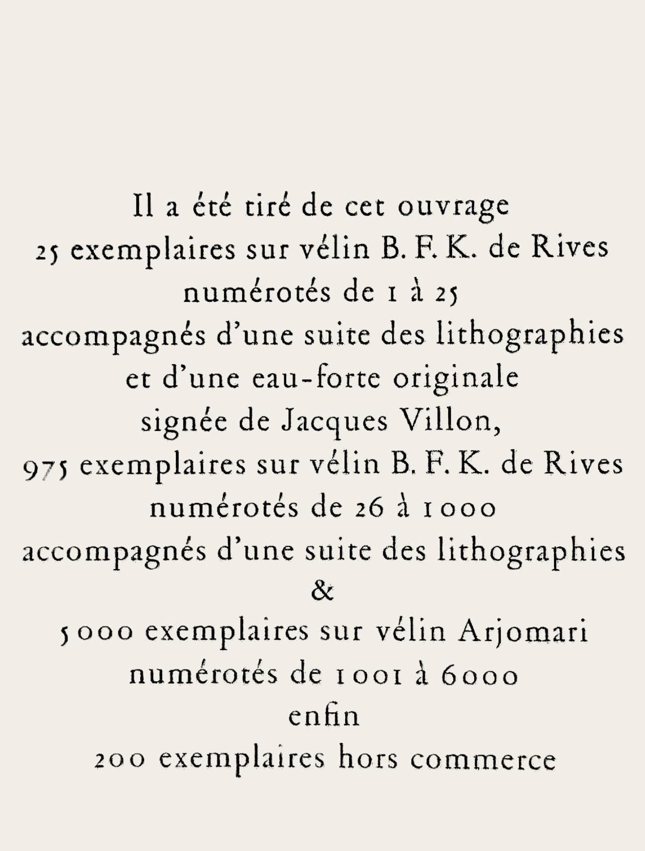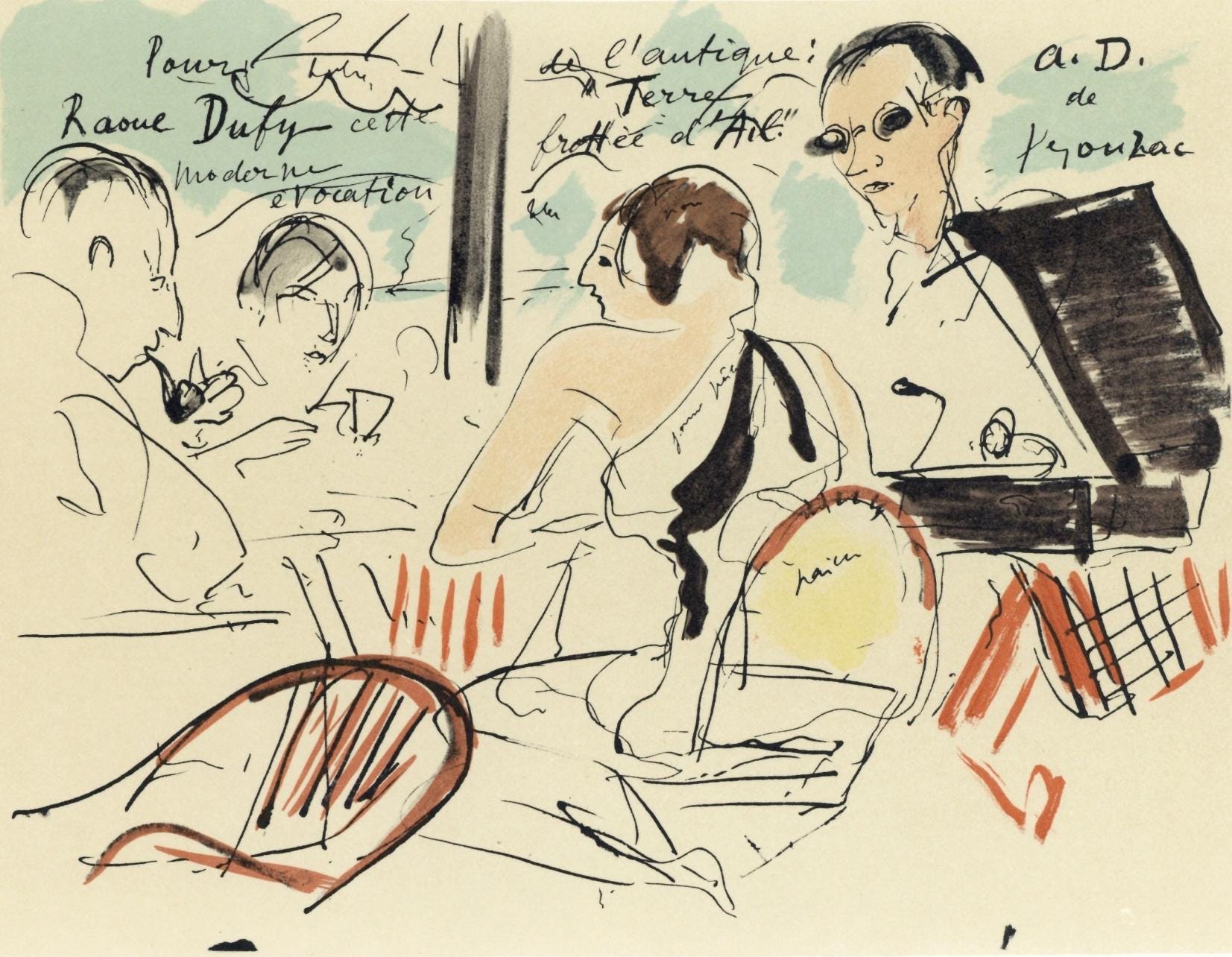 Lithograph on vlin d'Arches Arjomari paper. Paper size: 11.81 x 9.45 inches. Excellent condition. Unsigned and unnumbered, as issued. Notes: From the folio, Lettre mon peintre Raoul Dufy, 1965. Published by Librairie acadmique Perrin et Cie, Paris; printed by Fernand Mourlot, Paris, July 22, 1965. Excerpted from the folio (translated from French), The typography of this book is due to L'Imprimerie nationale. Mr. Andr Brignole being Director, and Paul Lajun as head of typography. The composition was made with the Garamont corps 20 proprit exclusive du grand tablissement d'tat sur les presses. The printing was completed on July 22, 1965. Color lithographs and black drawings as well as manuscripts were pulled on Fernand Mourlot's presses. Henri Jadoux was the director in charge of the work. It was taken from this book XXXV examples on vlin B. F. K. de Rives numbered from I to XXV, accompanied by a suite of lithographs and an original etching signed by Jacques Villon; CMLXXV examples on vlin B. F. K. de Rives numbered from XXVI to M, accompanied by a series of lithographs V? examples on Arjomari vlin numbered from MI to V?I?, and finally CC examples out of trade.