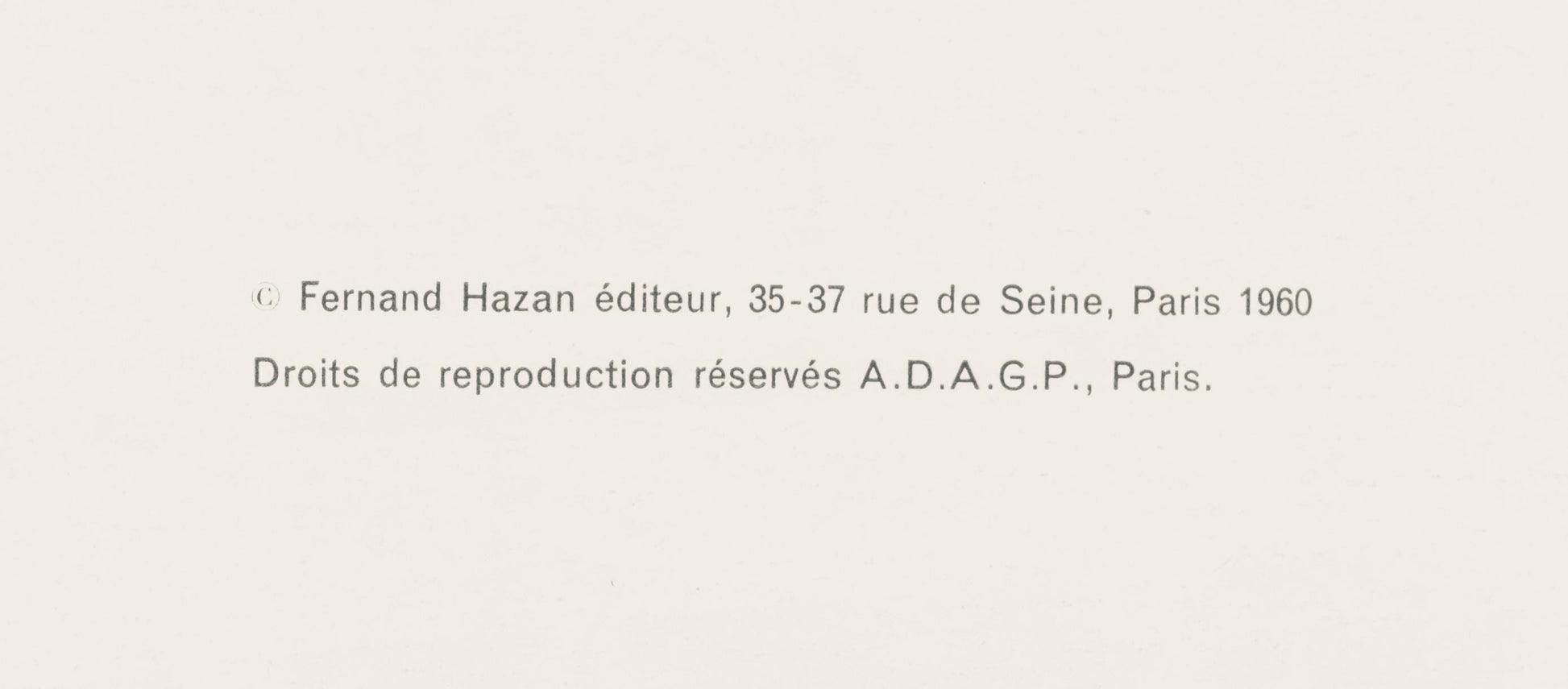 Published by Fernand Hazan, diteur, Paris; rendered by Clichs Union, Paris, and Bussire et Noul, Paris; printed by l'Imprimerie Lecot, Paris, April 1960.