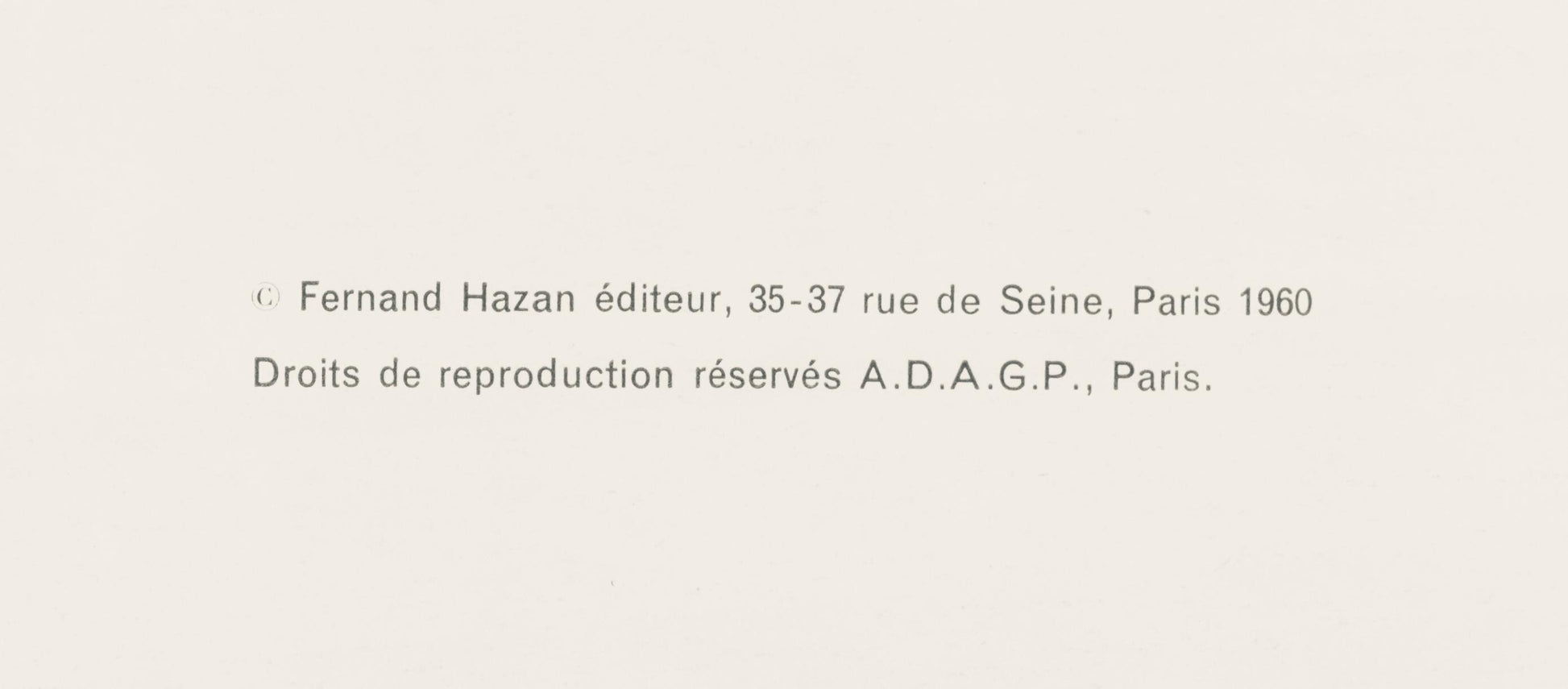 Published by Fernand Hazan, diteur, Paris; rendered by Clichs Union, Paris, and Bussire et Noul, Paris; printed by l'Imprimerie Lecot, Paris, April 1960.
