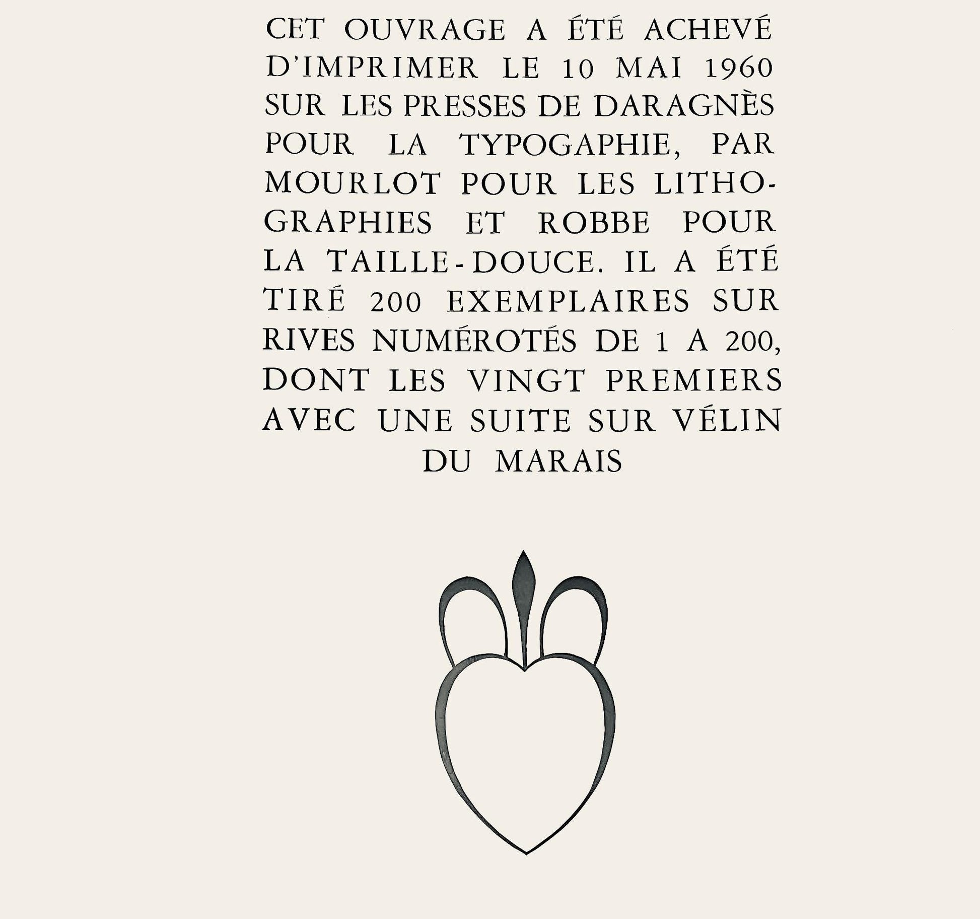 Excerpted from the album (translated from French), This work has been completed to print on May 10, 1960; on the presses de Jean-Gabriel Daragns for typography; by Mourlot Frres for lithographies; and, Robbe for intaglio. CC examples were drawn on Rives, numbered from I to CC, including the first XX with a suite on vlin du Marais.