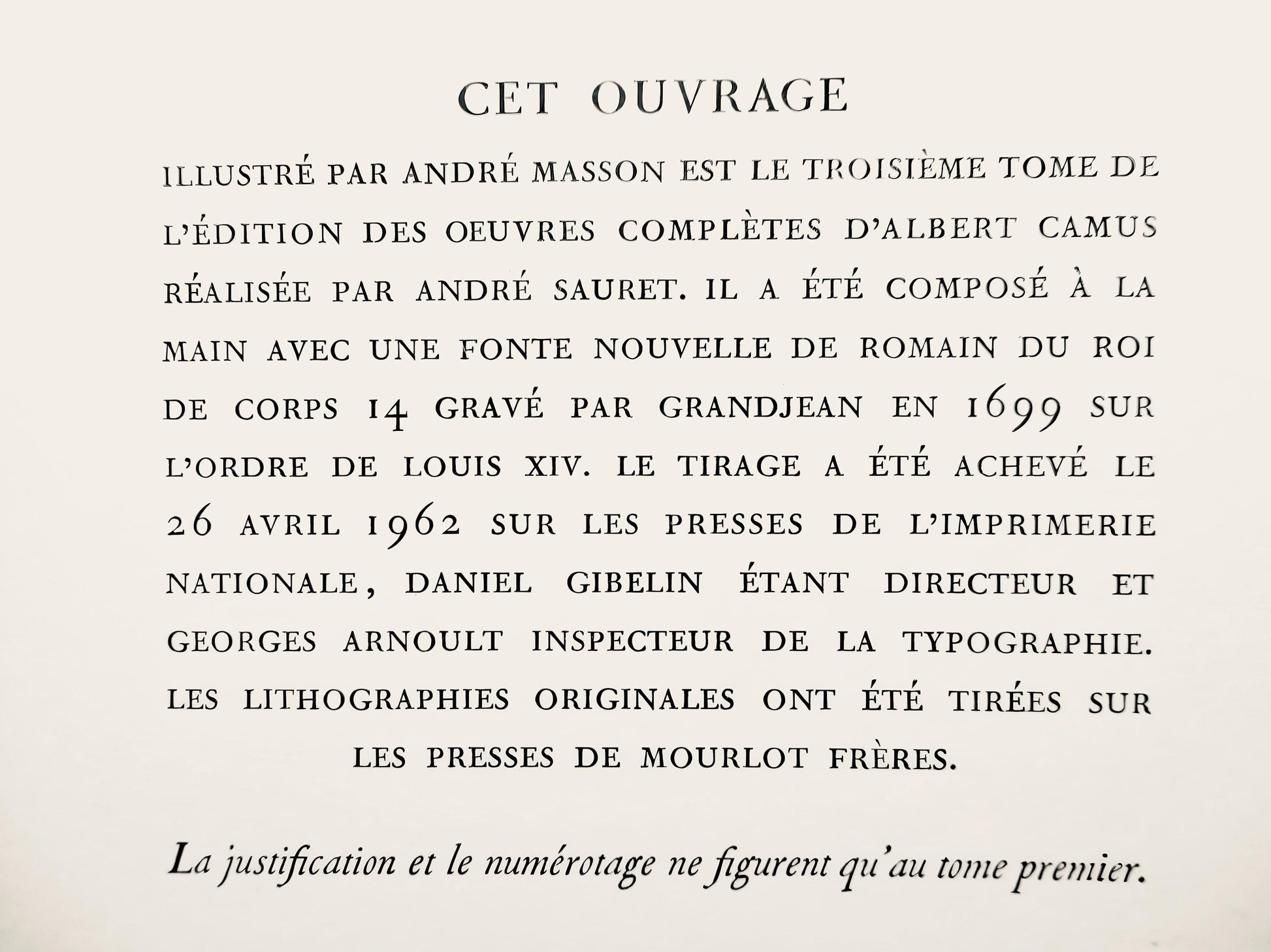 Excerpted from the album (translated from French), This album, illustrated by Andr Masson is the third volume of the edition of the uvres compltes d'Albert Camus, directed by Andr Sauret.
