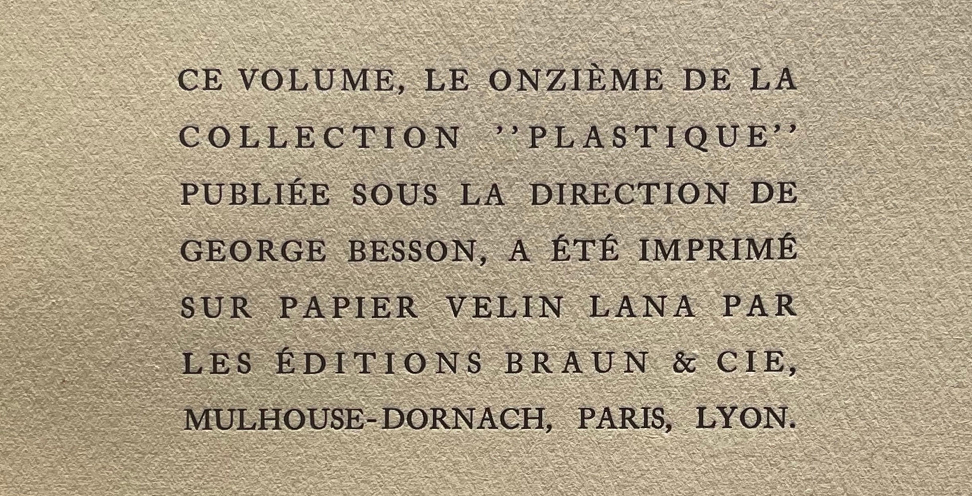 Published by George Besson, Paris; printed by Les ditions Braun & Cie, Mulhouse-Dornach, Paris, Lyon. Excerpted from the volume (translated from French), This volume, the eleventh of the "Plastique" collection published under the direction of George Besson, was printed on vlin Lana paper by Braun & Cie, Mulhouse-Dornach, Paris, Lyon.