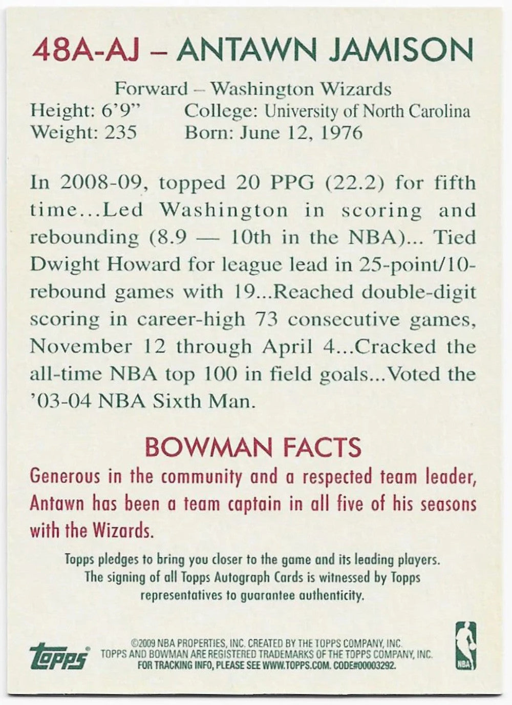 Antawn Jamison 2009 Bowman Autographed Card