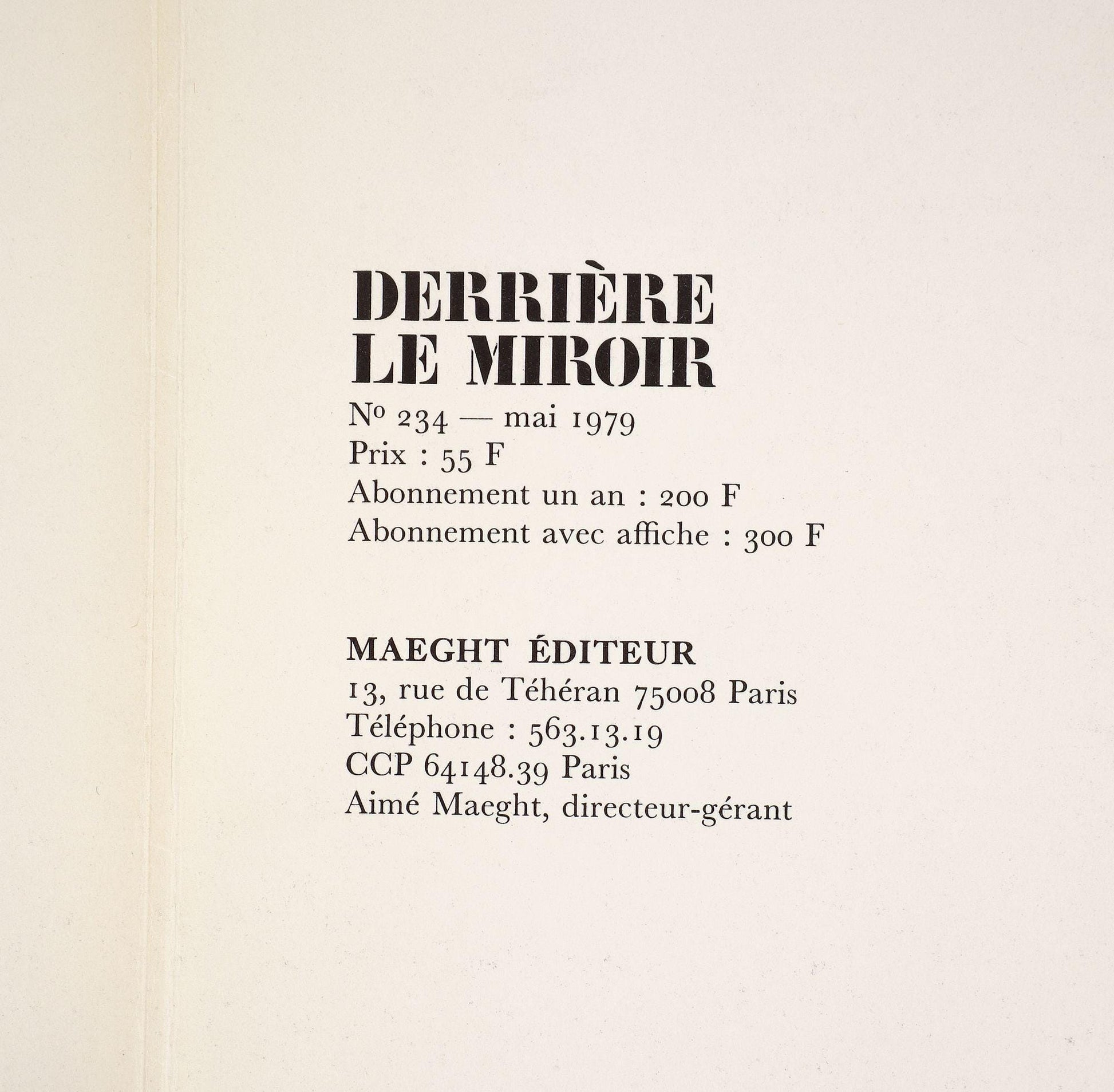 Lithograph on vlin paper. Paper size: 15 x 11 inches. Excellent condition. Inscription: Unsigned and unnumbered, as issued. Notes: From Derrire le miroir, N 234, 1979. Published by Aim Maeght, diteur, Paris; printed by ditions Pierre Feu, Galerie Maeght, Paris. Excerpted from a Christies, New York lot essay, The life span of Derrire le Miroir was thirty-five years. Publication began in 1946. Aim Maeght, initiator of Derrire le Miroir, had already made few attempts to ......