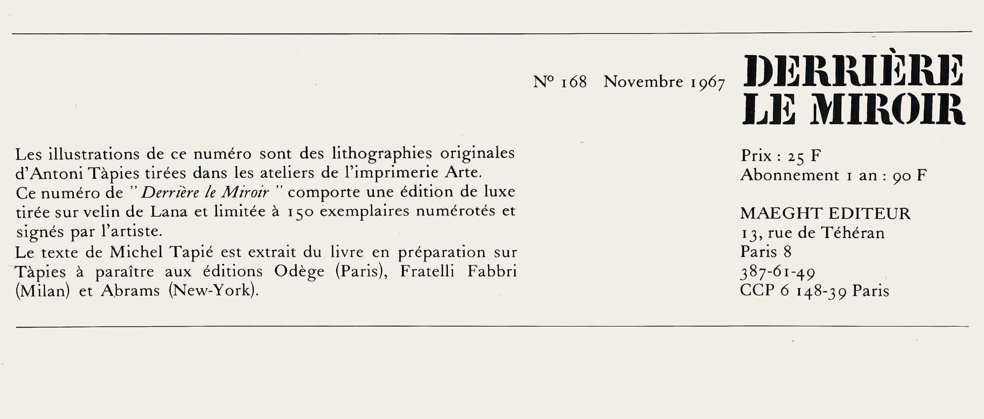 Excerpted from the volume (translated from French), The illustrations in this issue are original lithographs by Antoni Tpies shot in the workshops of l'imprimerie Arte.