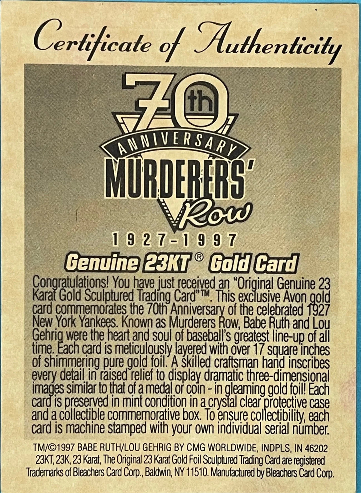 Babe Ruth & Lou Gehrig 1997 Bleachers Card 23Kt Gold Card