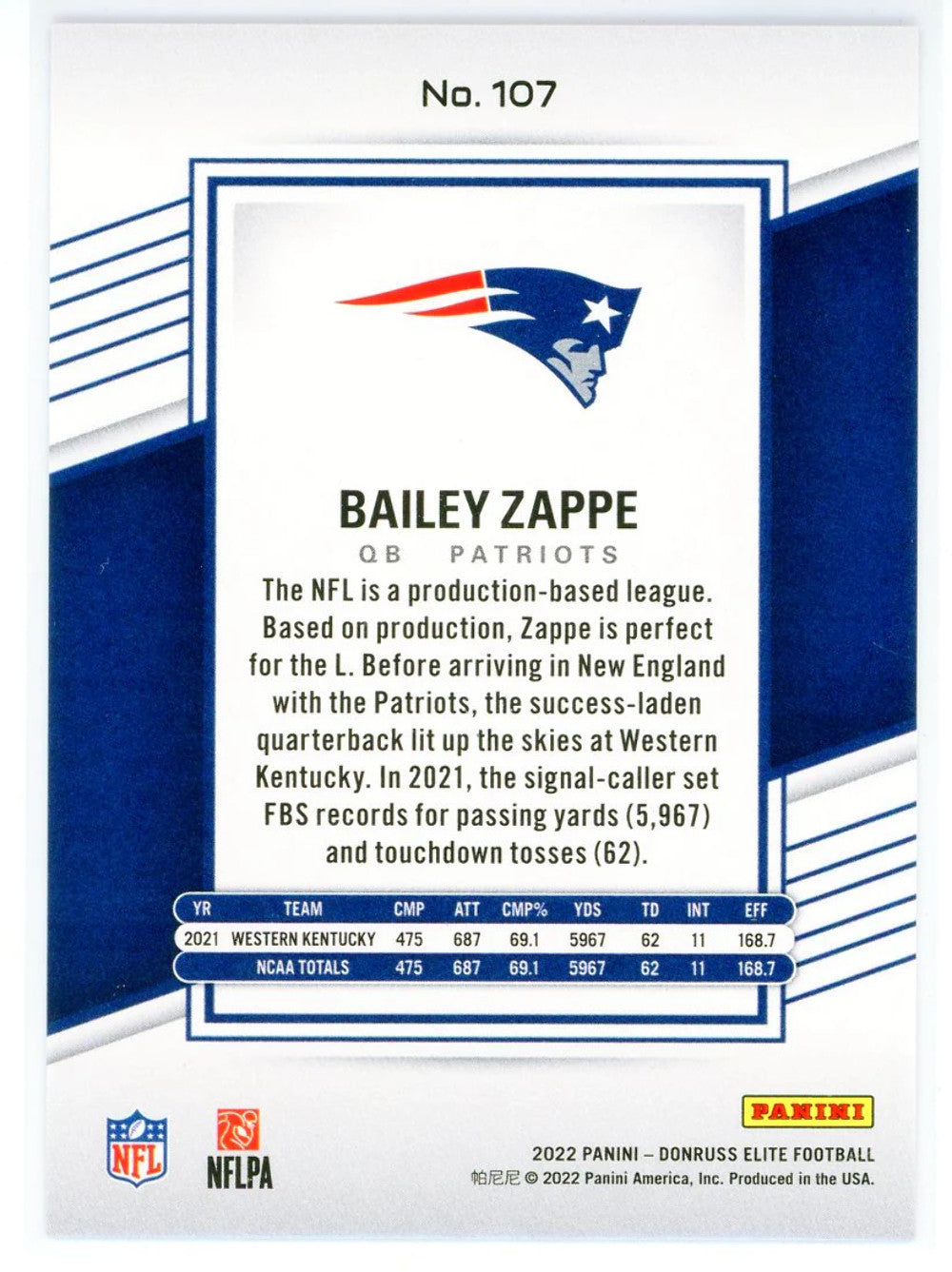 Bailey Zappe 2022 Panini Donruss Elite Rookie Card #107