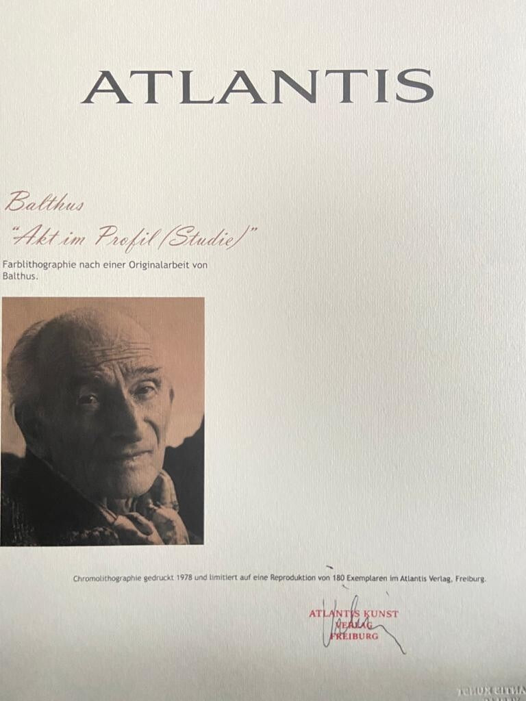 Balthus Lithograph COA Signed Numbered Stamped (Egon Schiele) Balthus "Nude in profile (study)" Chromolithography printed in 1978 in 180 specimens by Atlantis Verlag, Freiburg 30 x 42 cm Signature Balthus on the slab Dry and authentic stamp of the publishing house The progressive number could be different from the published one. Atlantis Kunst Verlag Freiburg Balthus "Nude in profile (study)" Chromolithography printed in 1978 in 180 specimens by Atlantis Verlag, Freiburg 30 x 42 cm Signature Balthuson the slab Dry and authentic stamp of the publishing house The progressive number could be different from the published one. Atlantis Kunst Verlag Freiburg