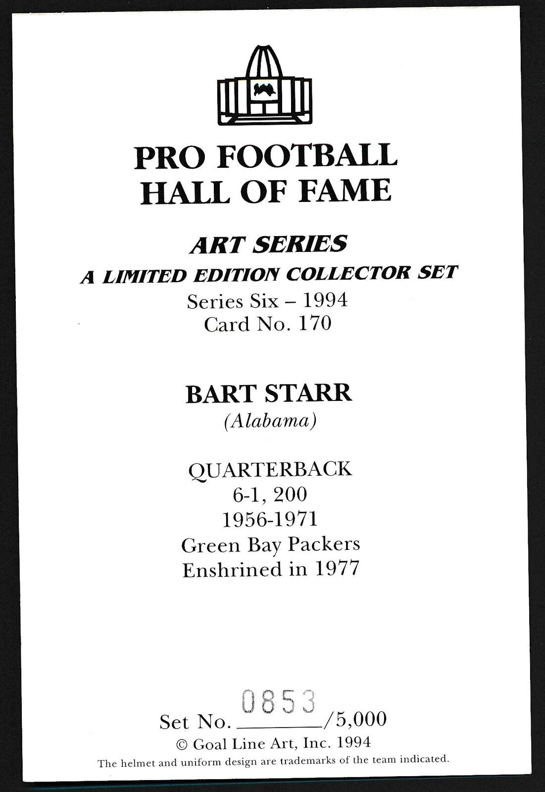 Bart Starr Hof Packers Signed/Inscr 1994 Goal Line Art Glac Postcard 163106