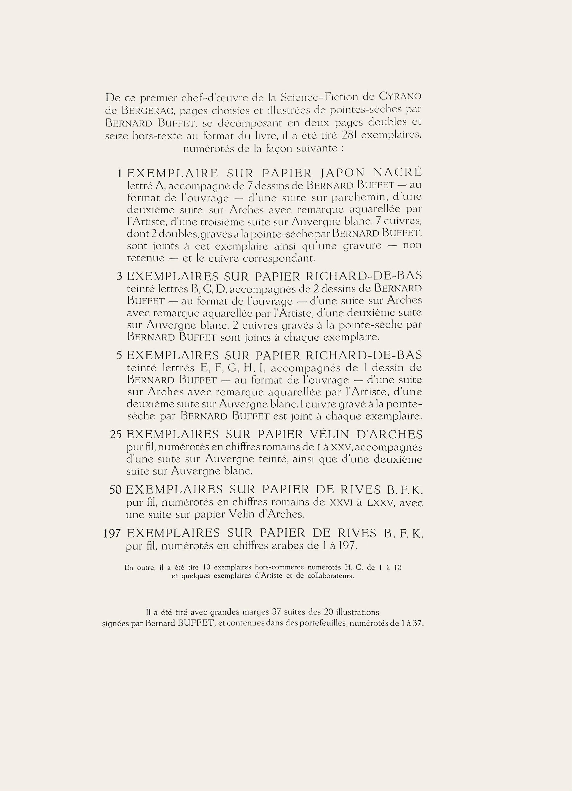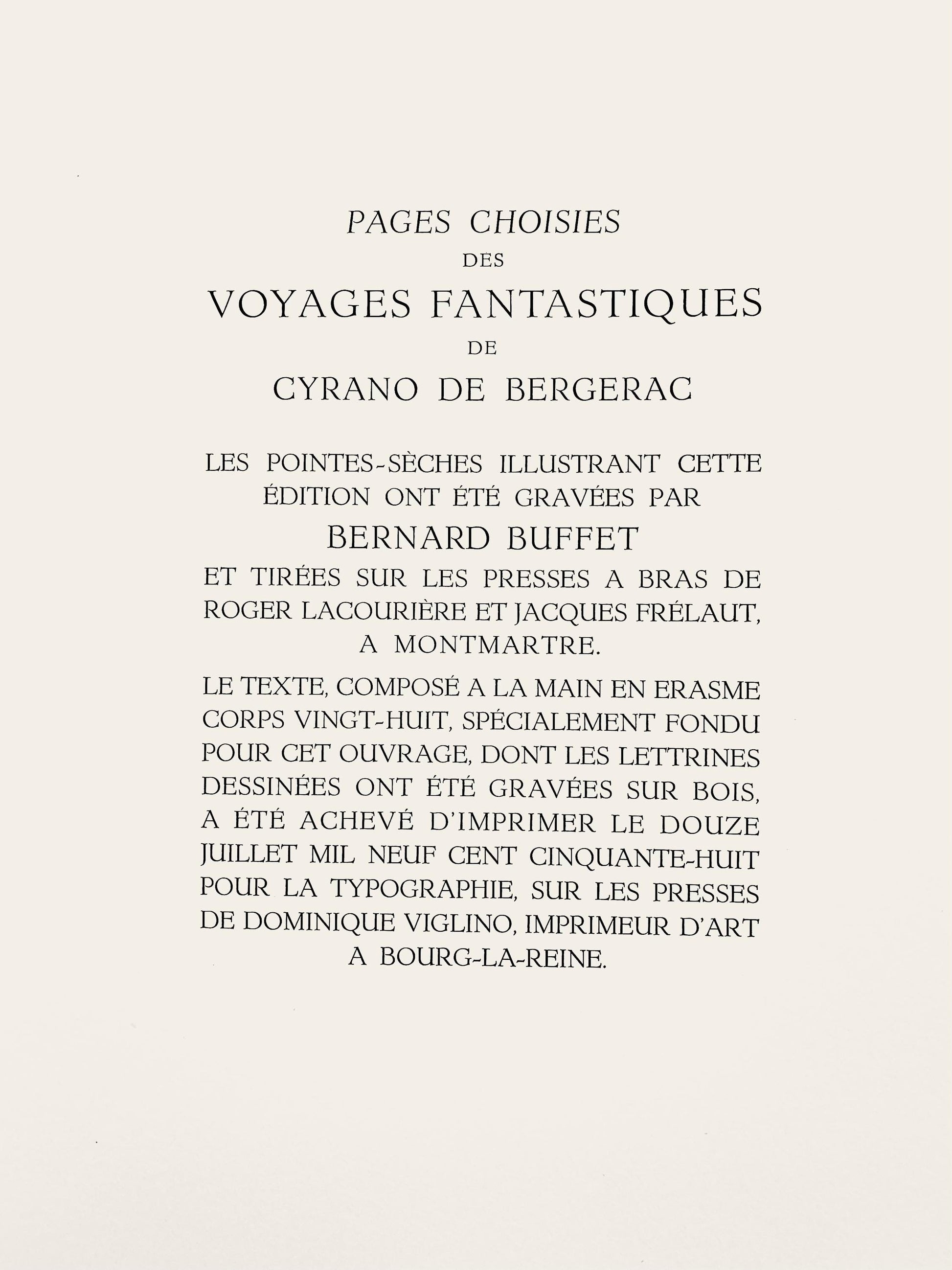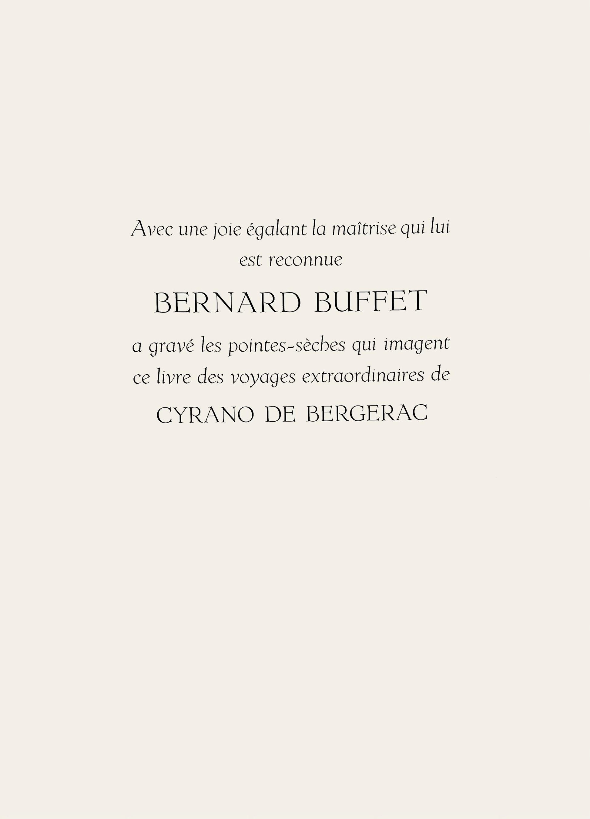 Drypoint etching on papier de Rives B.F.K. pur fil paper. Paper size: 16.125 x 12.875 inches. Excellent condition. Unsigned and unnumbered, as issued. Notes: From the folio, Voyages fantastiques aux tats et empires de la lune et du soleil, 1958. Published by Joseph Foret, diteur d'Art, Paris; printed by Roger Lacourire et Jacques Frelaut, Montmartre, Paris, July 12, 1958. Excerpted from the folio (translated from French), Recognizing a joy equaling the mastery, Bernard Buffet engraved the dry tips that populate this folio of The Extraordinary Journeys of Cyrano de Bergerac. Selected pages of Fantastic Trips of Cyrano de Bergerac the dry tips illustrating this edition have been engraved by Bernard Buffet and shot on the presses, with the arms of Roger Lacourire and Jacques Frelaut, in Montmartre. The text, composed by hand in erasme body twenty-eight, specially melted for this work, whose drawn letters were engraved on wood, was completed to print the Twelve, July, One Thousand Nine Hundred and Fifty-Eight for typography, on the presses of Dominique Viglino, art printer in Bourg-la-Reine. From this first masterpiece of Science Fiction by Cyrano de Bergerac, pages selected and illustrated with dry tips by Bernard Buffet, broken down into two double pages and sixteen off-text in the format of the folio, 281 examples were printed, numbered as follows: 1 example on Papier Japon Nacre lettered A, accompanied by 7 drawings by Bernard Buffetin the format of the folioa suite on parchment, a second suite on Arches with a watercolor remark by the Artist, a third suite on white Auvergne. 7 coppers, including 2 doubles, engraved in dry tip by Bernard Buffet, are attached to this example as well as an engravingnot selectedand the corresponding copper. 3 examples on Papier Richard-de-Bas teint lettered B, C, D, accompanied by 2 drawings by Bernard Buffetin the format of the booka suite on Arches with watercolor noted by the Artist, a second suite on white Auvergne. 2 coppers engraved with a dry tip by Bernard Buffet are attached to each example. 5 examples on Papier Richard-de-Bas teint lettered E, F, G, H, I, accompanied by the drawing by Bernard Buffetin the format of the folioa suite on Arches with a watercolor remark by the Artist, a second suite on white Auvergne. 1 engraved with a dry tip on copper by Bernard Buffet is attached to each example. 25 examples on vlin dArches pur fil paper, numbered in Roman numerals from I to XXV, accompanied by a suite on tinted Auvergne, as well as a second suite on white Auvergne. 50 examples on Papier de Rives B.F.K. pur fil, numbered in Roman numers from XXVI to LXXV, with a suite on Vlin d'Arches paper. 197 examples on Papier de Rives B.F.K. pur fil, numbered in Arabic numerals from 1 to 197. In addition, 10 non-commercial examples were drawn numbered H.-C. from 1 to 10 and some examples for the artist and collaborators. It was drawn with large margins 37 following the 20 illustrations signed by Bernard Buffet, and contained in portfolios, numbered from 1 to 37.