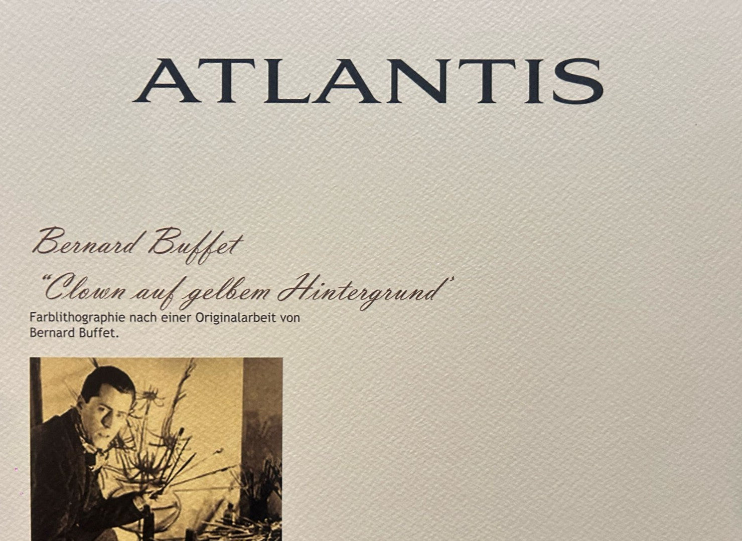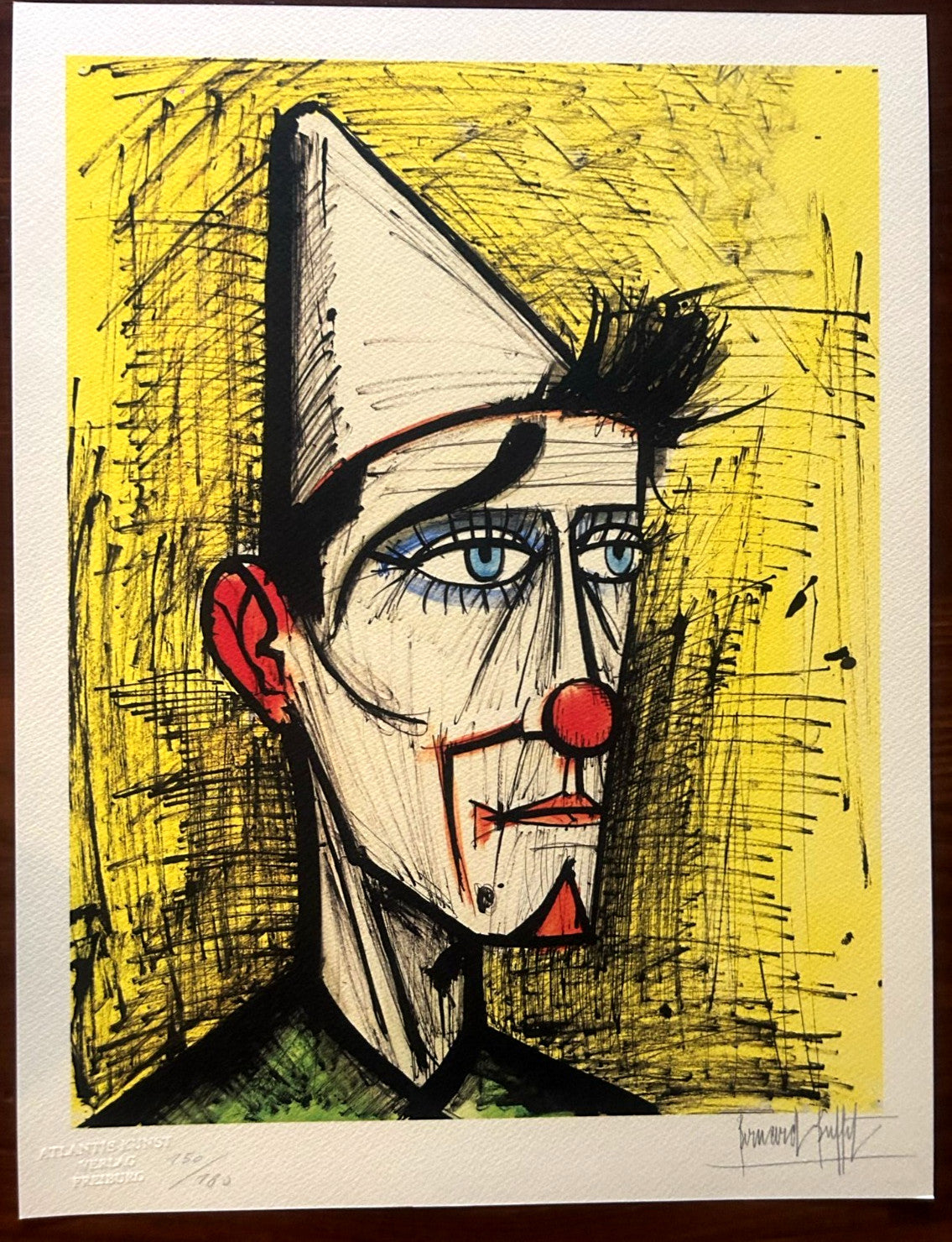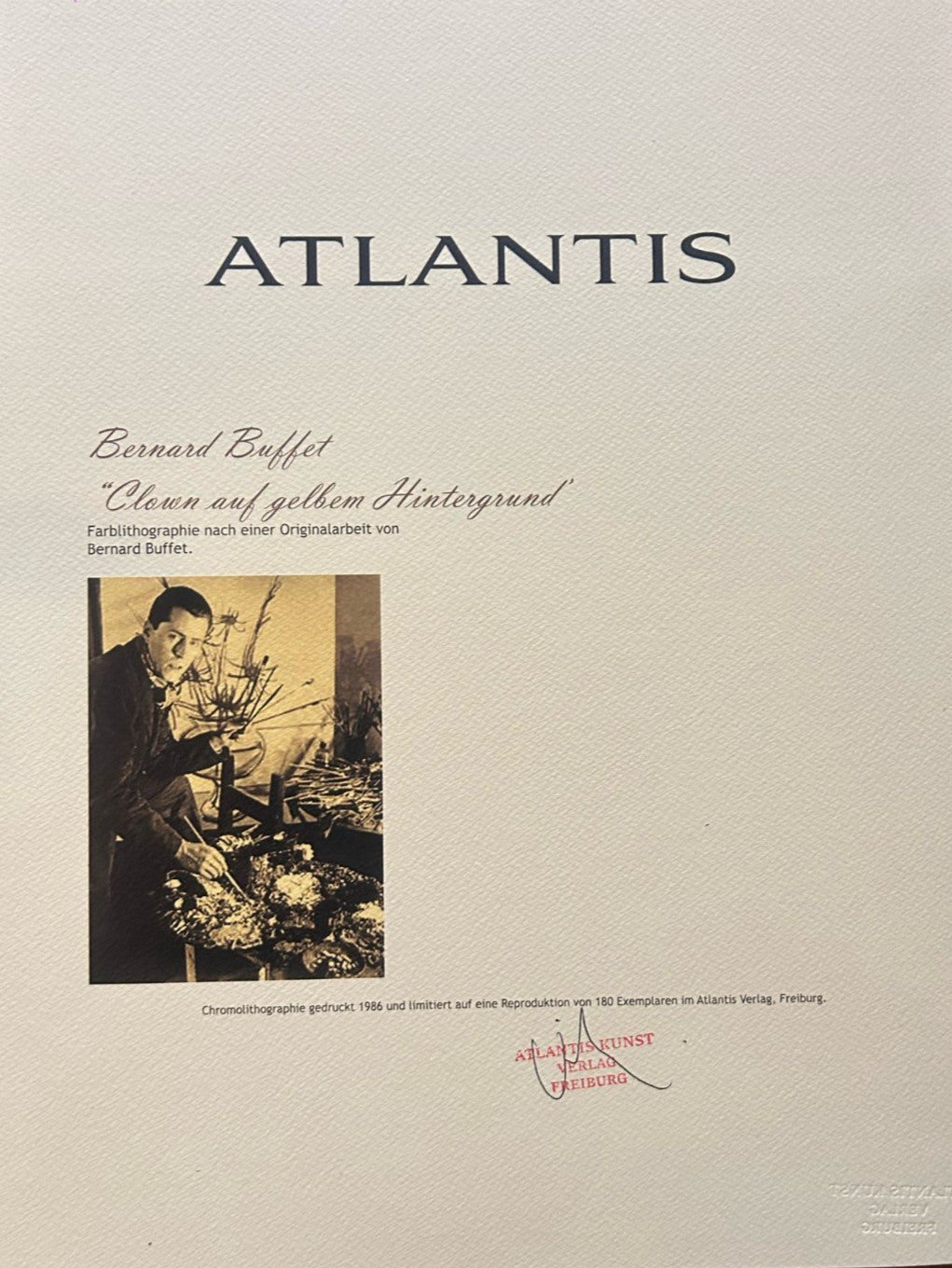 Bernard Buffet Lithograph Certified COA (Signed Op With Numbered Pen And Pencil) Bernard Buffet '' P Agliaccio on yellow background " Chromolithography printed in 1986 in 180 specimens by Atlantis Verlag, Freiburg 32 x 42 cm Signature Bernard Buffet on the slab - COA signed in Penna Dry and authentic stamp of the publishing house Atlantis Kunst Verlag Freiburg Bernard Buffet '' PAgliaccio on yellow background" Chromolithography printed in 1986 in 180 specimens by Atlantis Verlag, Freiburg 32 x 42 cm Signature Bernard Buffet on the slab-COA signed in Penna Dry and authentic stamp of the publishing house Atlantis Kunst Verlag Freiburg