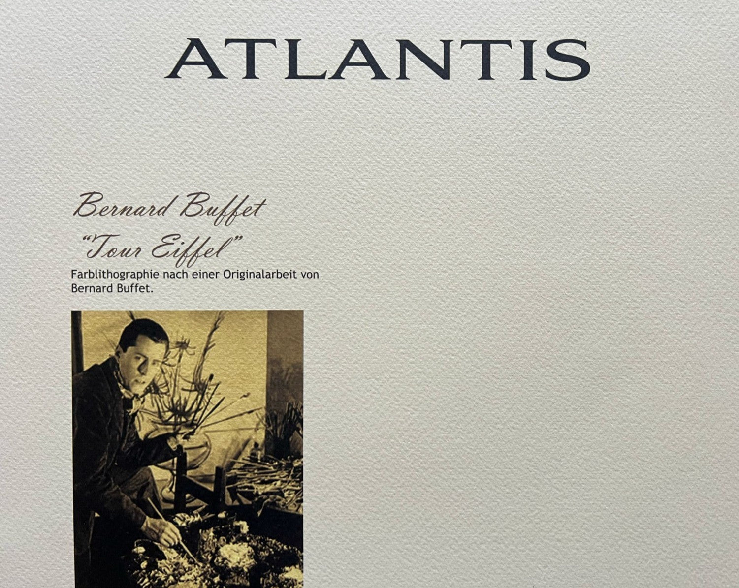Bernard Buffet Lithograph Certified COA Signed op Pen (Numbered Pencil) Bernard Buffet '' Eiffel Tour " Chromolithography printed in 1986 in 180 specimens by Atlantis Verlag, Freiburg 32 x 53 cm Signature Bernard Buffet on the slab - COA signed in Penna Dry and authentic stamp of the publishing house Atlantis Kunst Verlag Freiburg Bernard Buffet '' Eiffel Tour" Chromolithography printed in 1986 in 180 specimens by Atlantis Verlag, Freiburg 32 x 53 cm Signature Bernard Buffet on the slab-COA signed in Penna Dry and authentic stamp of the publishing house Atlantis Kunst Verlag Freiburg