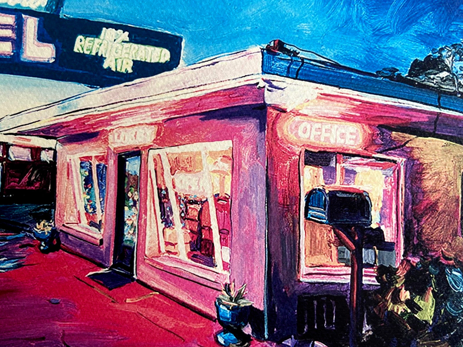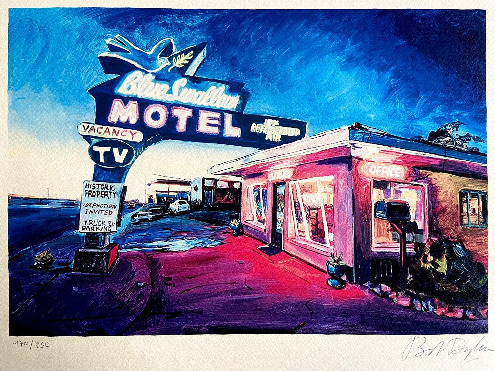 BOB DYLAN ''Blue Swallow Motel: Route 66 " 250 copies n hand-humed 30 x 41 cm Bob Dylan signature printed in lithograph on the plate Modern Art Museum, Shanghai Bob Dylan took inspiration from the people and places he encountered along the way. He represents one of the most influential cultural icons of our era. No In recent decades, he has increasingly put aside his guitar in favor of the brush and pencil, actively pursuing his passion for the visual arts. On November 30, 2021, the Patricia & Phillip Frost Art Museum at Florida International University hosted a major retrospective of Dylan's visual art. Retrospectrum spans six decades of his drawing, painting and sculpture and was first exhibited at the Modern Art Museum in Shanghai (2019). Dylan tends to work in series, often switching from one artistic style to another. The artist created landscapes , nostalgic scenes of America along Route 66 , illustrations based on his texts and colorful representations of cities from around the world. Bob Dylan took inspiration from the people and places he encountered along the way. He represents one of the most influential cultural icons of our era. NoIn recent decades, he has increasingly put aside his guitar in favor of the brush and pencil, actively pursuing his passion for the visual arts. On November 30, 2021, the Patricia & Phillip Frost Art Museum at Florida International University hosted a major retrospective of Dylan's visual art. Retrospectrum spans six decades of his drawing, painting and sculpture and was first exhibited at the Modern Art Museum in Shanghai (2019). Dylan tends to work in series, often switching from one artistic style to another.The artist createdlandscapes, nostalgic scenes of America alongRoute 66, illustrations based onhis textsand colorful repr