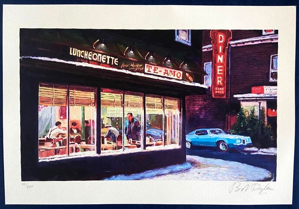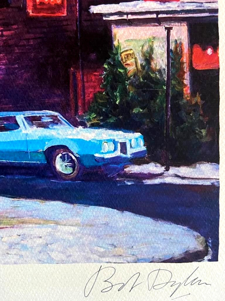 Bob Dylan Lithograph Signed COA Numbered By Hand [Edward Hopper] Bob Dylan '' Night Time St. Louis " 'Retrospectrum' Itinerant exhibition, Tulsa, Shanghai, Miami, Rome 31 x 45 cm 250 specimens n Handed by hand. Signature Bob Dylan printed in Lithograph on the slab The progressive number could be different from the published one. Modern Art Museum, Shanghai Bob Dylan took inspiration from the people and places he met along the way. It represents one of the most influential cultural icons of our time. N He last decades has increasingly put aside his guitar in favor of the brush and pencil, actively pursuing his passion for the visual arts. On November 30, 2021, Patricia & Phillip Frost Art Museum of Florida International University hosted an important retrospective of Dylan's visual art. Retrospectrum embraces six decades of his design, painting and sculpture and was exhibited for the first time at the Modern Art Museum in Shanghai (2019). Dylan tends to work in series, often going from one artistic style to another. The artist created landscapes , nostalgic scenes of long America La Route 66 , illustrations based on his texts and colored representations of cities around the world. Bob Dylan took inspiration from the people and places he met along the way. It represents one of the most influential cultural icons of our time. NHe last decades has increasingly put aside his guitar in favor of the brush and pencil, actively pursuing his passion for the visual arts. On November 30, 2021, Patricia & Phillip Frost Art Museum of Florida International University hosted an important retrospective of Dylan's visual art. Retrospectrum embraces six decades of his design, painting and sculpture and was exhibited for the first time at the Modern Art Museum in Shanghai (2019). Dylan tends to work in series, often going from one artistic style to another.The artist createdlandscapes, nostalgic scenes of long AmericaLa Route 66, illustrations based onhis textsand colored repre Related keywords bob dylan bob dylan signed lithograph edward hopper bob dylan art lithograph signed numbered bob dylan artwork warhol hand signed signed lithograph etching signed numbered etching signed signed bob dylan bob dylan prints bob dylan signed art prints edward hopper print bob dylan painting bob dylan signed art prints limited edition bob dylan lithograph edward hopper edward hopper signed signed bob dylan artwork edward hopper signed art bob dylan art signed bob dylan signed art bob dylan hand signed art prints signed and numbered bob dylan print signed art by bob dylan bob dylan signed art bob dylan artwork Provided by