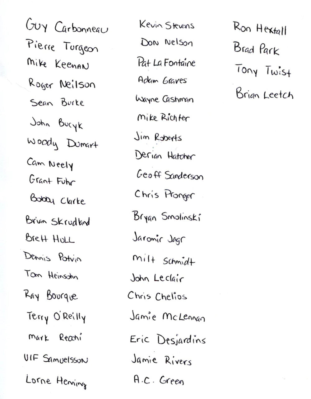 Signatures includes, Guy Carbonneau, Pierre Turgeon, Mike Keenan, Roger Neilson, Sean Burke, Johnny Bucyk, Woody Dumart, Cam Neely, Grant Fuhr, Bobby Clark, Brian Skrudland, Brett Hull, Denis Potvin, Tom Heinsohn, Ray Bourque, Terry O'Reilly, Mark Recchi, Ulf Samuelsson, Lorne Henning, Kevin Stevens, Don Nelson, Pat LaFontaine, Adam Graves, Wayne Cashman, Mike Richter, Jim Roberts, Derian Hatcher, Geoff Sanderson, Chris Pronger, Bryan Smolinski, Jaromir Jagr, Milt Schmidt, John LeClair, Chris Chelios, Jamie Rivers, Jamie McLennan, Eric Desjardins, AC Green, Ron Hextall, Brad Park, Tony Twist, Brian Leetch
