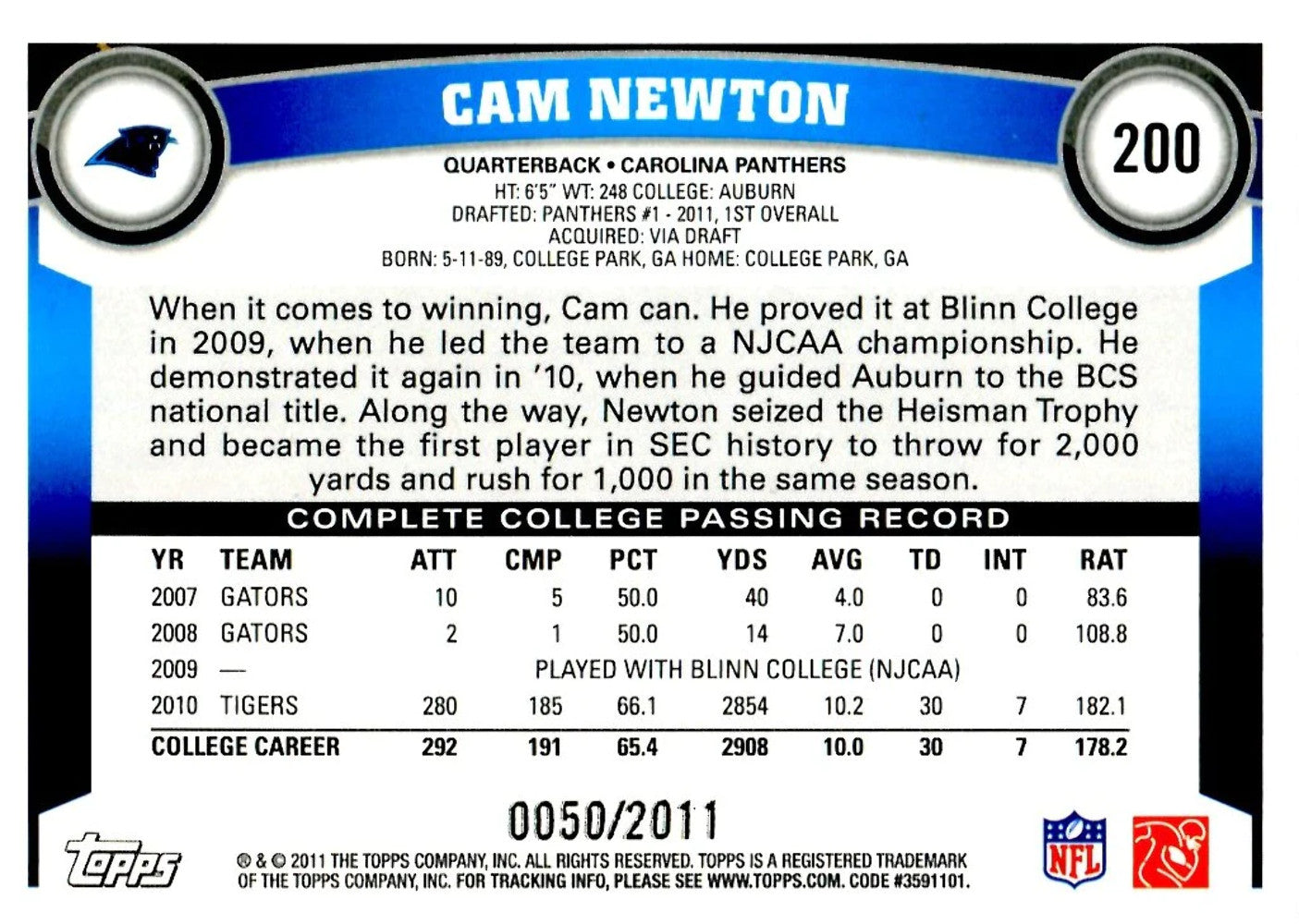 Cam Newton 2011 Unsigned Topps Rookie Card Gold Parallel #50/2011