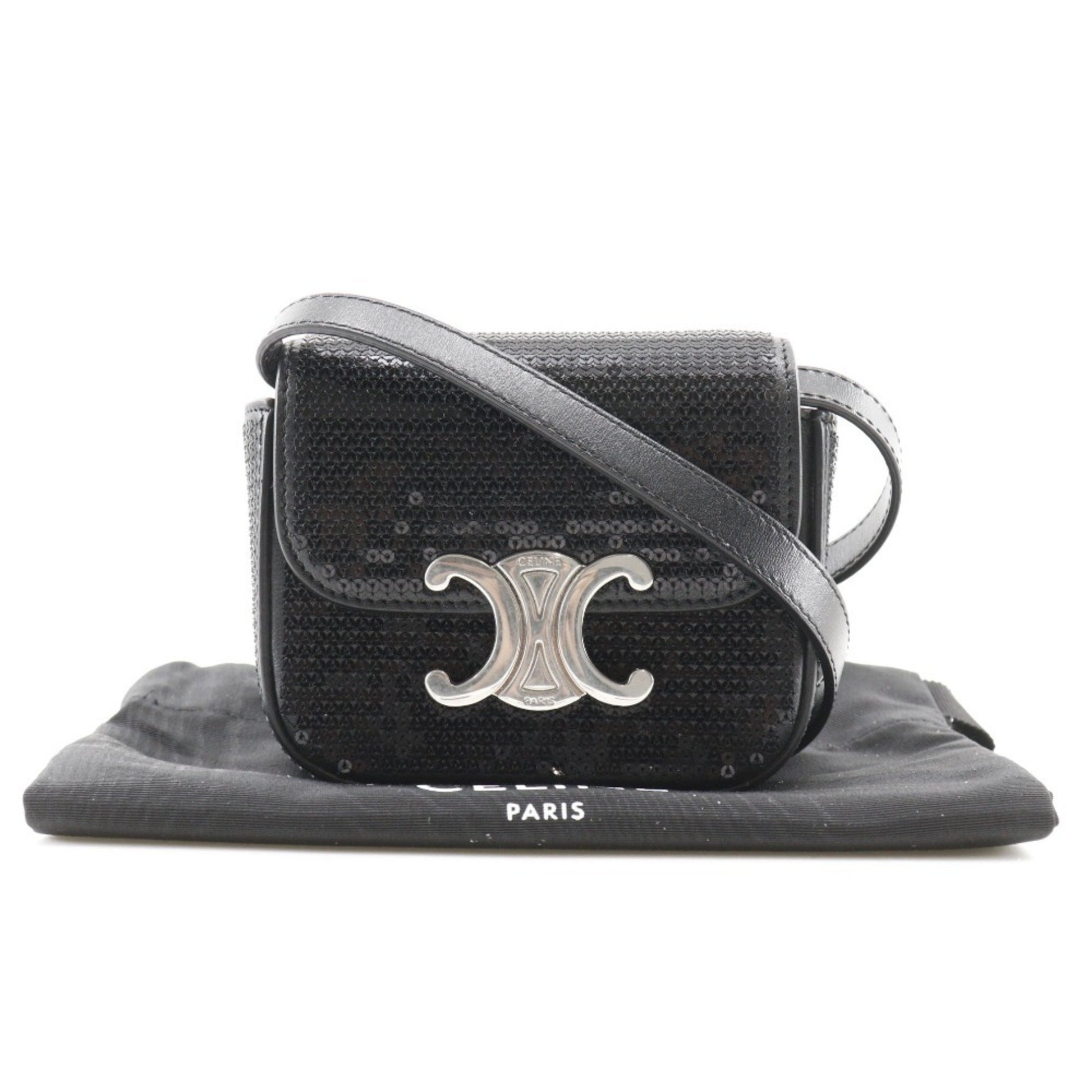 Celine Mini Triomphe Shoulder Bag Clutch Leather X Sequins Black 2Way Snap Button