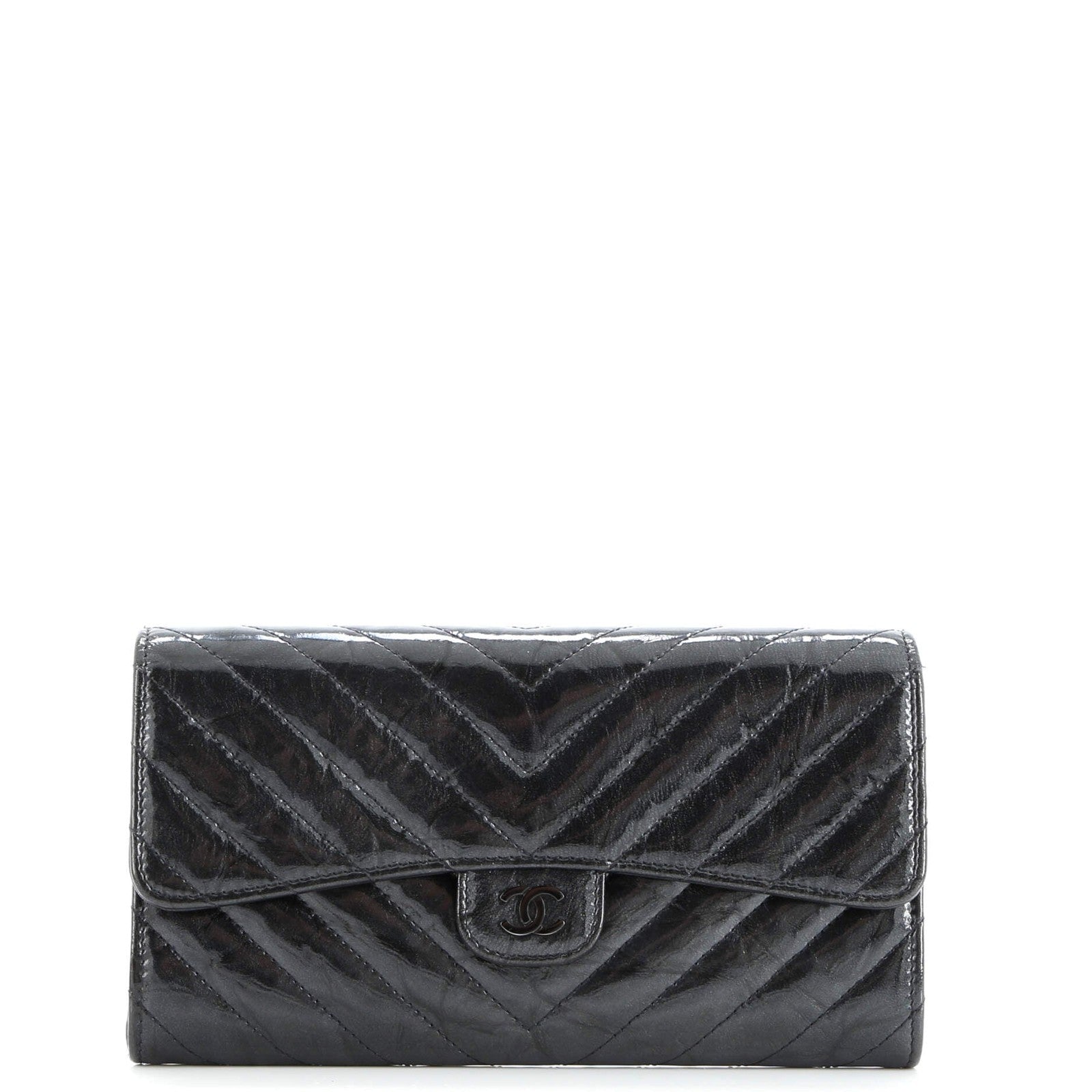 Chanel So Black Cc Gusset Classic Flap Wallet Chevron Crumpled Metallic Patent