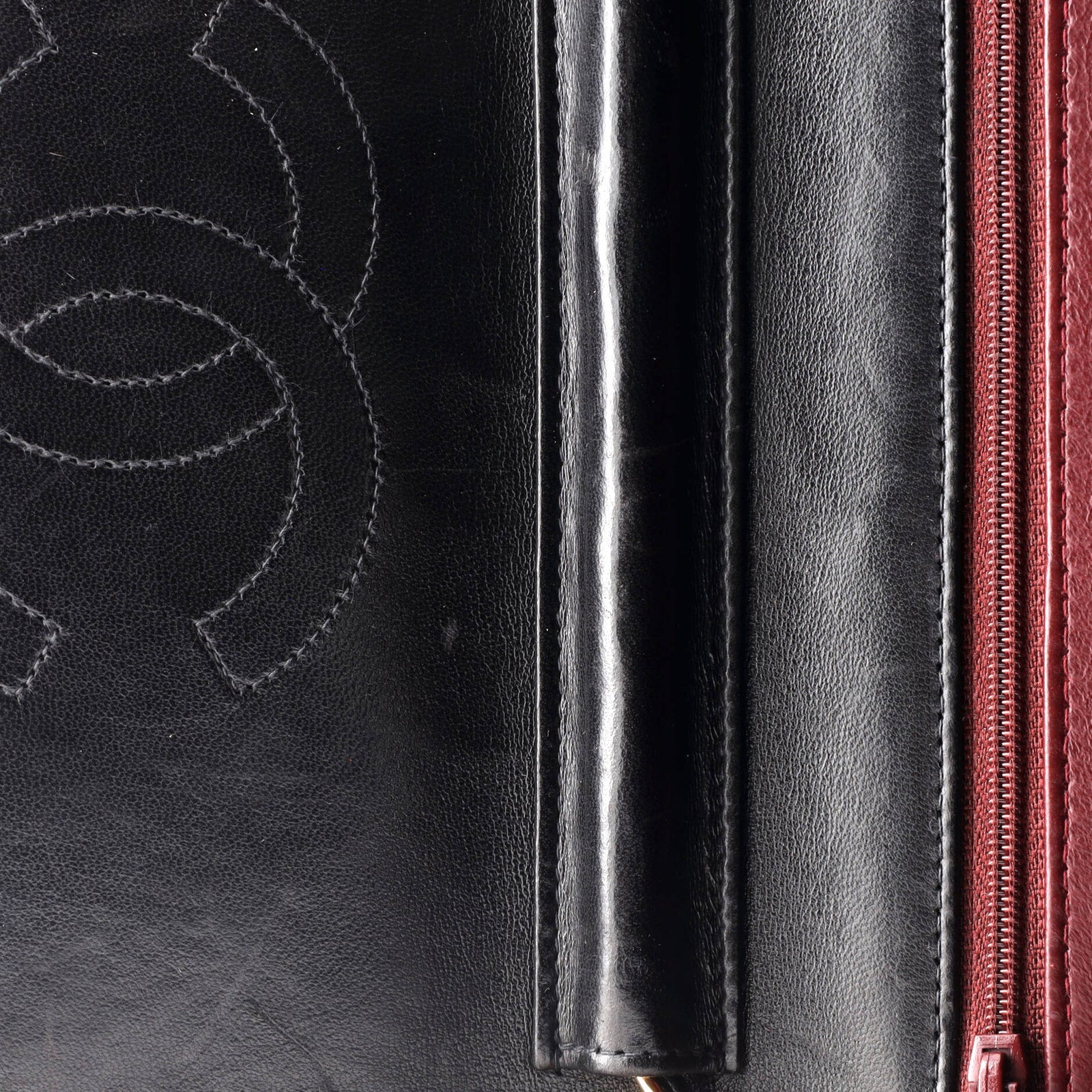 Condition: Very good. Given age, use and present condition, the hardware on this item may have been re-plated. Moderate creasing, scuffs and wear on exterior, underneath flap and in interior, scratches on hardware.