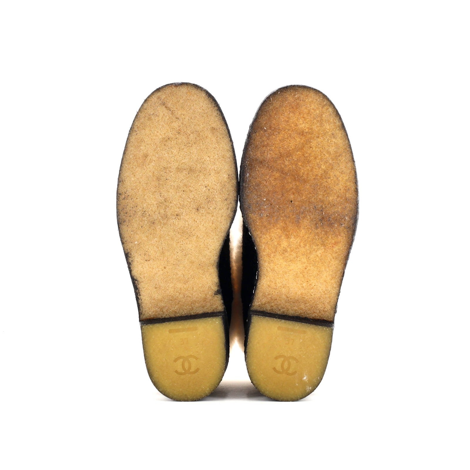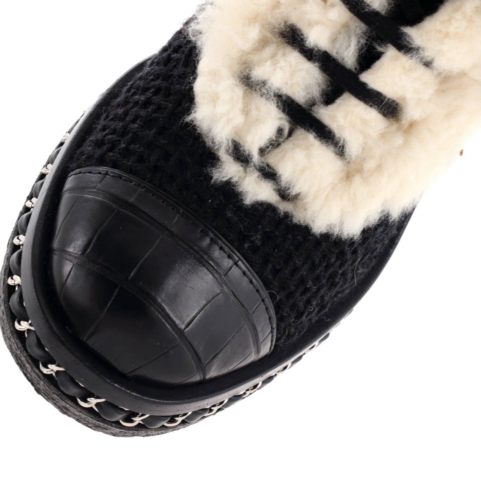 Chanel Women'S Chain Sole Cap Toe Lace Up Ankle Boots Tweed And Fur With Leather