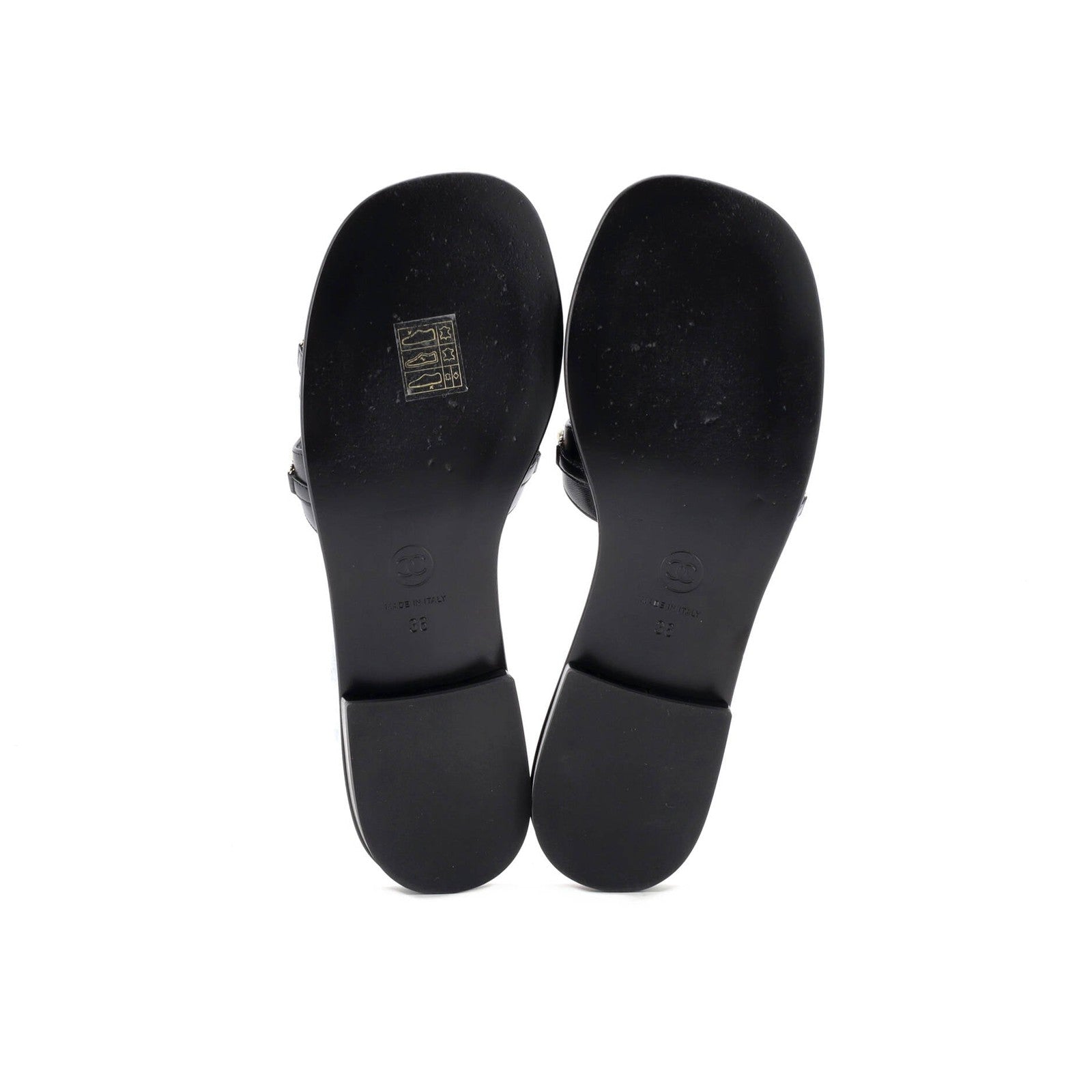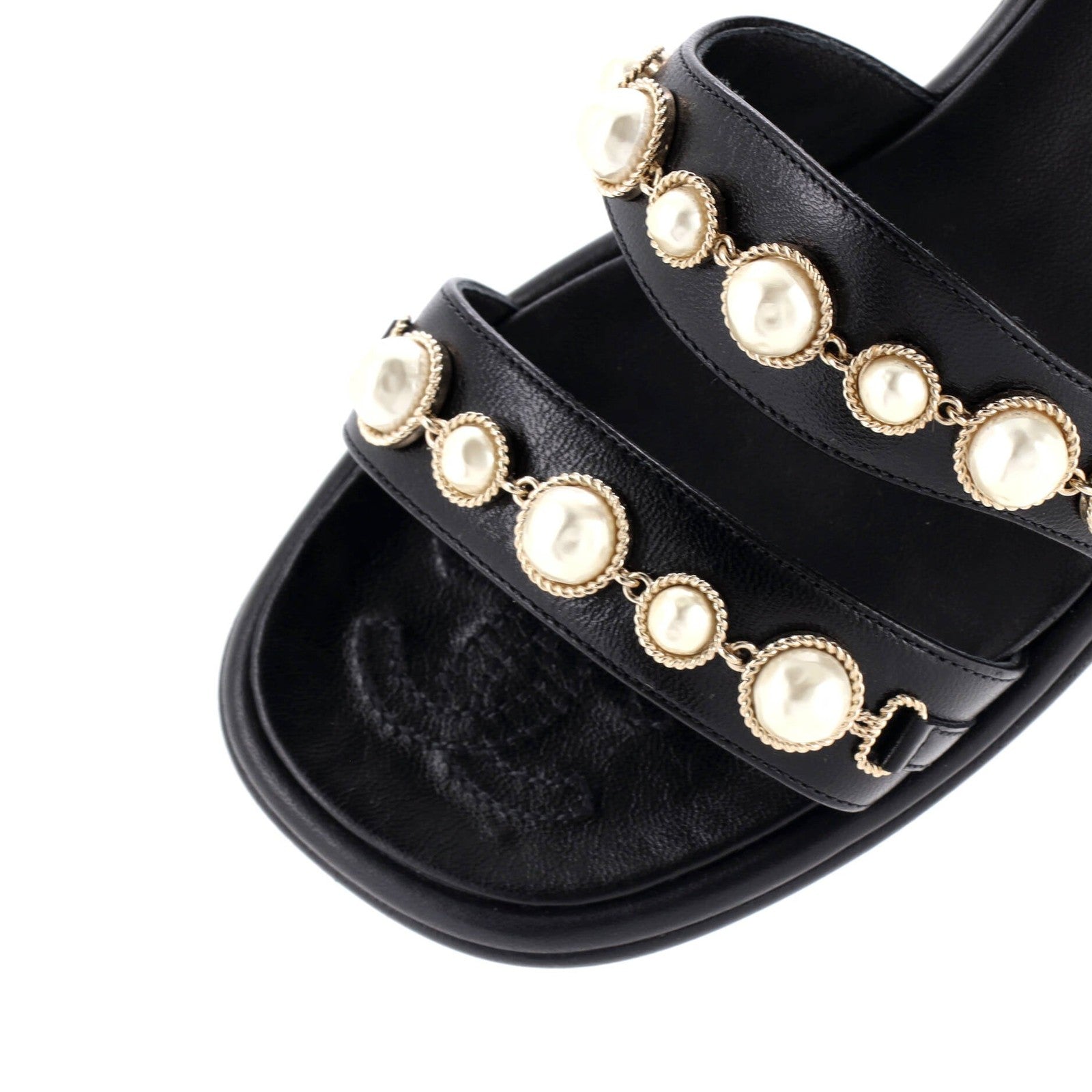 Chanel Women'S Double Strap Slide Sandals Leather And Faux Pearls