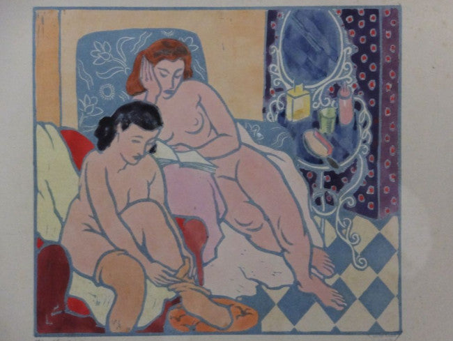 Clment Serveau 1945 Signed Color Woodcut "Moment Of Rest" Nude W/ Stamp Paris