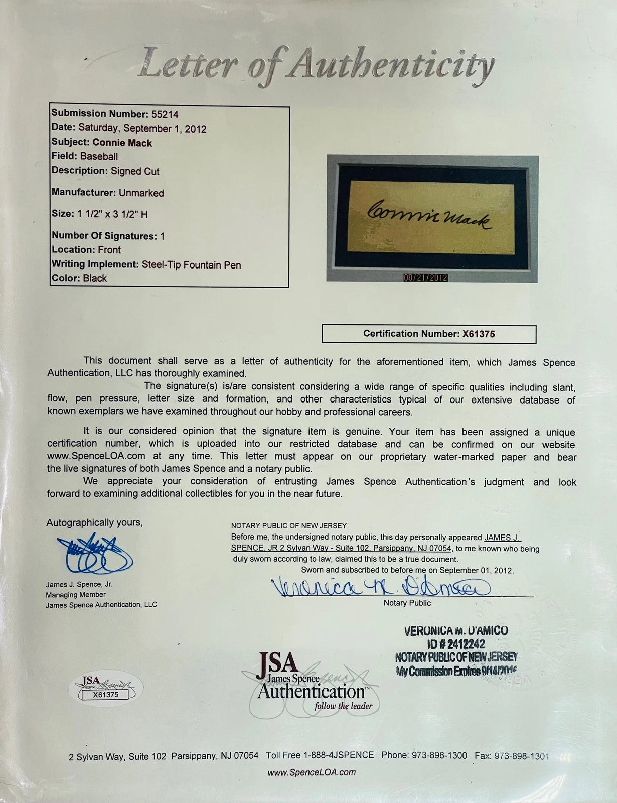 Connie Mack Autographed Framed Cut (Jsa)
