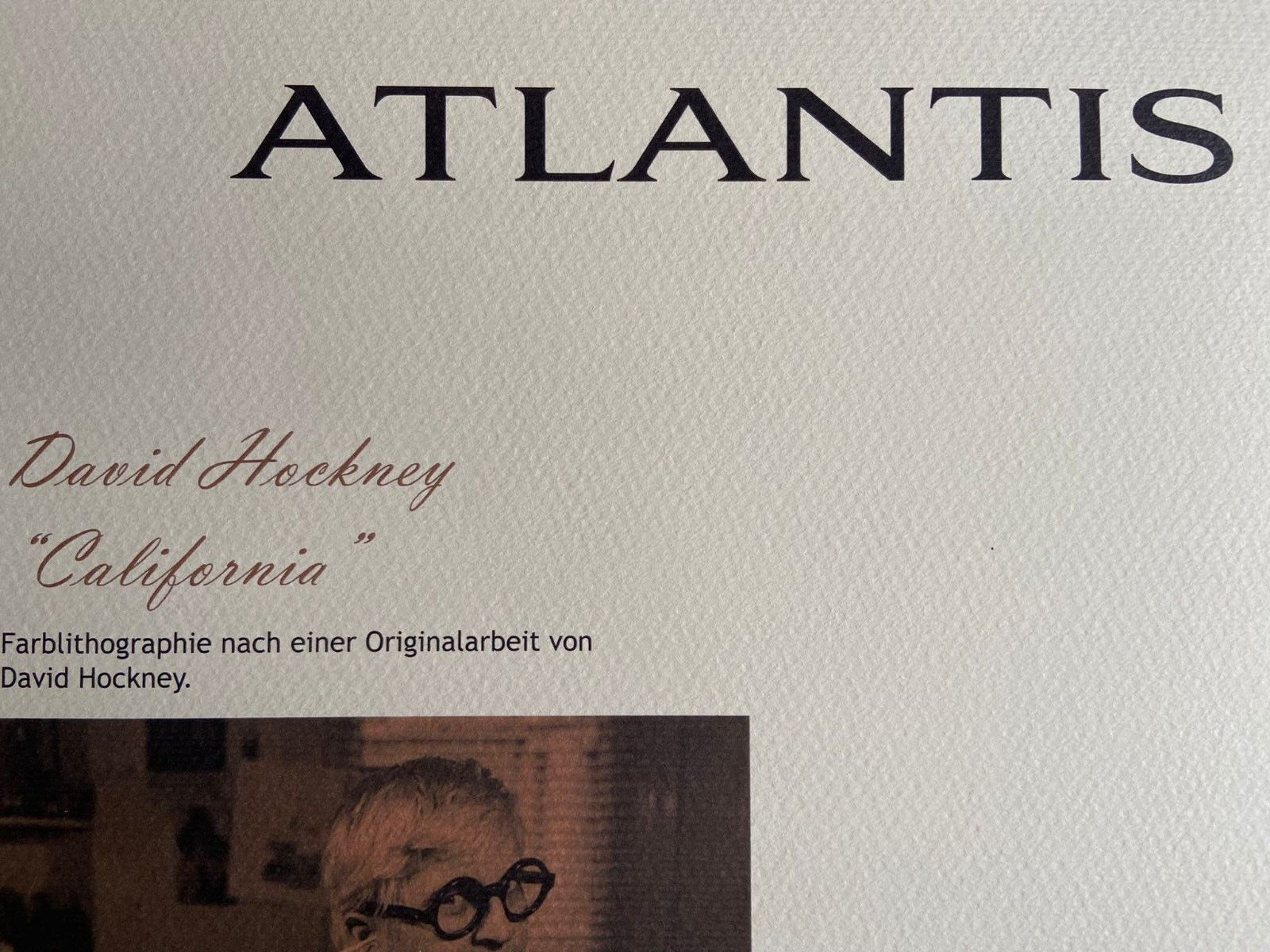 David Hockney "California" Lithograph COA Numbered 180 Copies Stamp David Hockney "California " Chromolithography printed in 1997 in 180 specimens by Atlantis Verlag, Freiburg 32 x 38 cm Signature David Hockney on the slab COA signed in pen and stamped Dry and authentic stamp of the publishing house The progressive number could be different from the published one. Atlantis Kunst Verlag Freiburg David Hockney "California" Chromolithography printed in 1997 in 180 specimens by Atlantis Verlag, Freiburg 32 x 38 cm Signature David Hockney on the slab COA signed in pen and stamped Dry and authentic stamp of the publishing house The progressive number could be different from the published one. Atlantis Kunst Verlag Freiburg