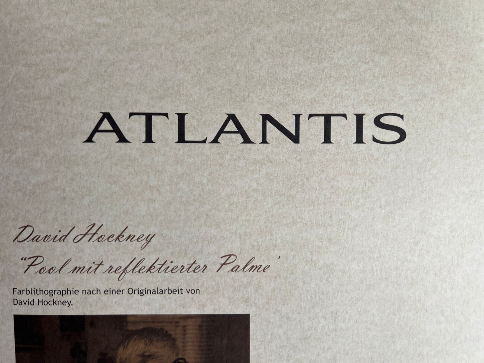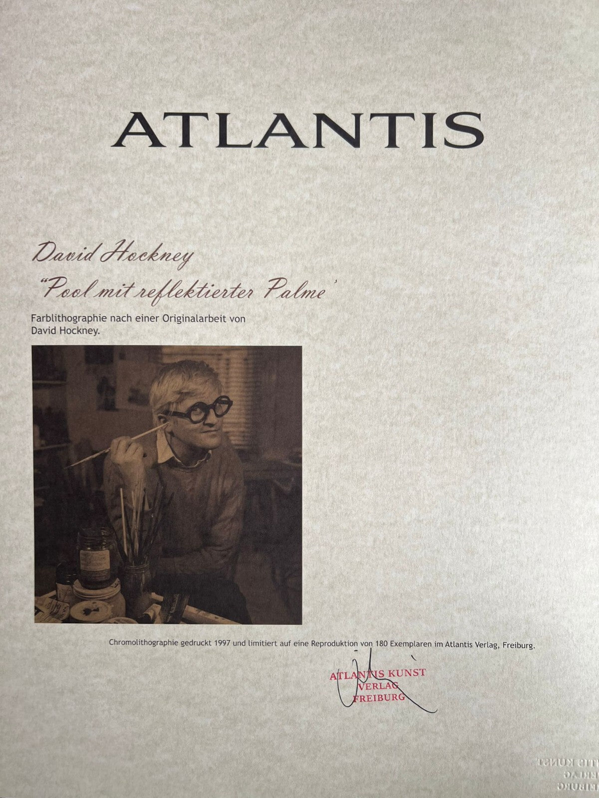 David Hockney Lithograph COA Signed [Hand Numbered Limited Edition] David Hockney " Pool with reflected palm " Chromolithography printed in 1997 in 180 specimens by Atlantis Verlag, Freiburg 32 x 40 cm Signature David Hockney on the slab Dry and authentic stamp of the publishing house The progressive number could be different from the published one. Atlantis Kunst Verlag Freiburg David Hockney "Pool with reflected palm" Chromolithography printed in 1997 in 180 specimens by Atlantis Verlag, Freiburg 32 x 40 cm Signature David Hockney on the slab Dry and authentic stamp of the publishing house The progressive number could be different from the published one. Atlantis Kunst Verlag Freiburg