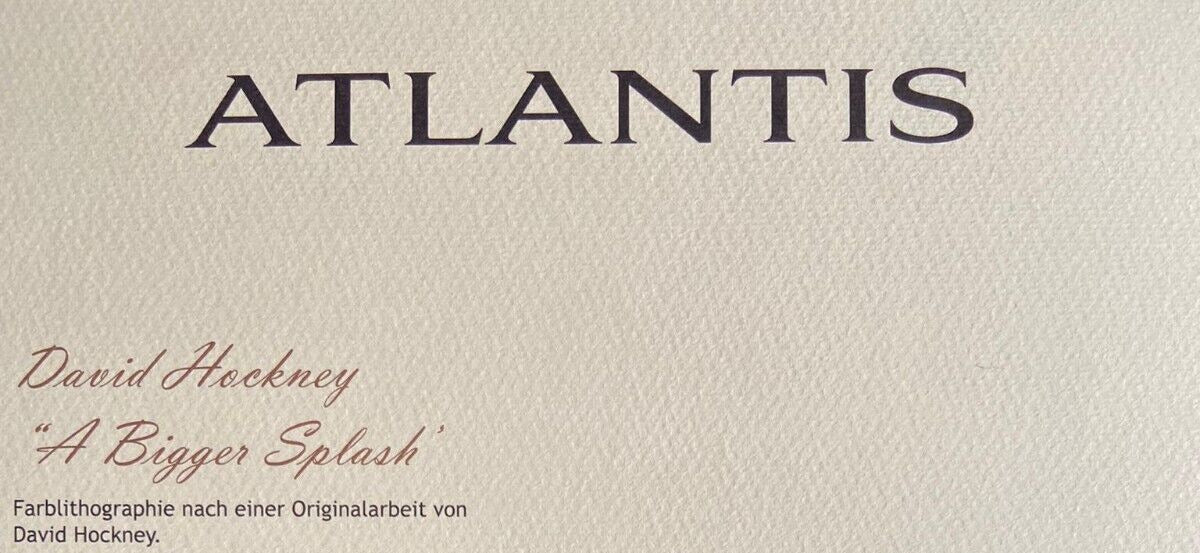 David Hockney Lithograph COA Signed In Pen Numbered In Pencil David Hockney "A bigger splash " Chromolithography printed in 1997 in 180 specimens by Atlantis Verlag, Freiburg 32 x 32 cm Signature David Hockney on the slab - COA signed in Penna Dry and authentic stamp of the publishing house The progressive number could be different from the published one. Atlantis Kunst Verlag Freiburg David Hockney "A bigger splash" Chromolithography printed in 1997 in 180 specimens by Atlantis Verlag, Freiburg 32 x 32 cm Signature David Hockney on the slab -COA signed in Penna Dry and authentic stamp of the publishing house The progressive number could be different from the published one. Atlantis Kunst Verlag Freiburg