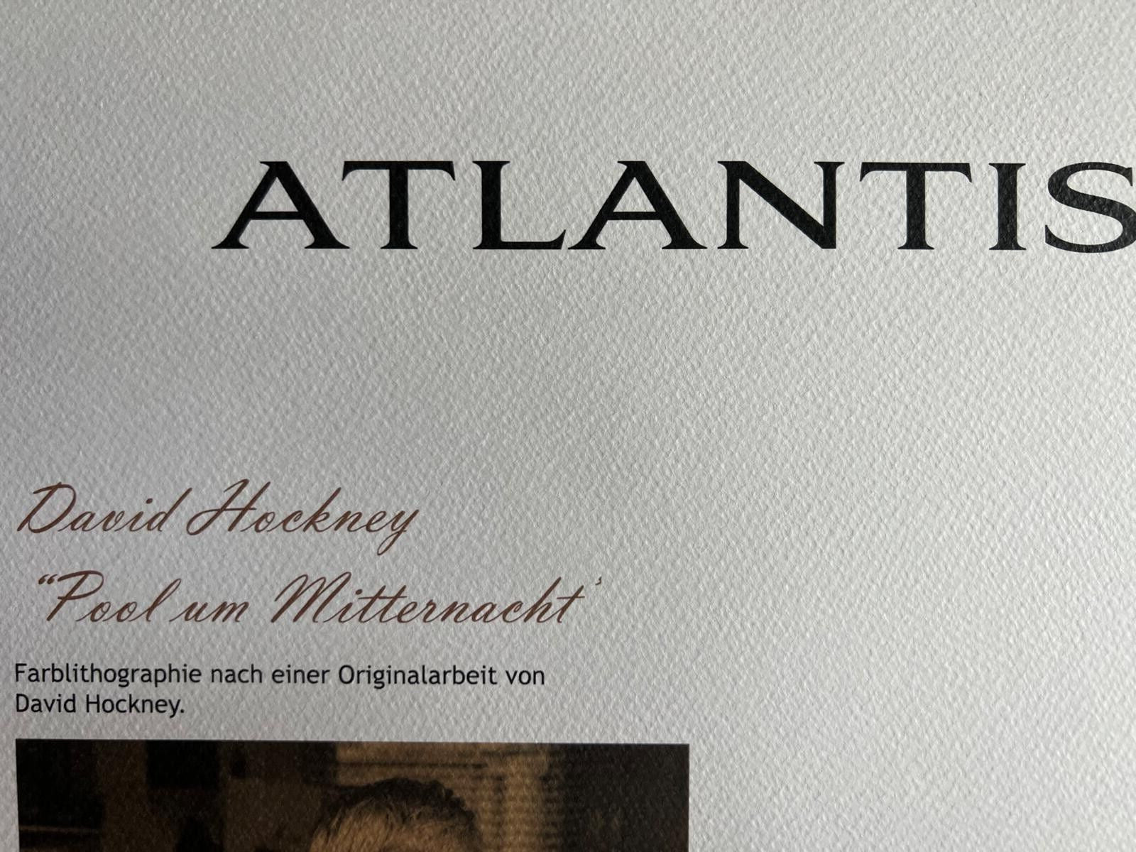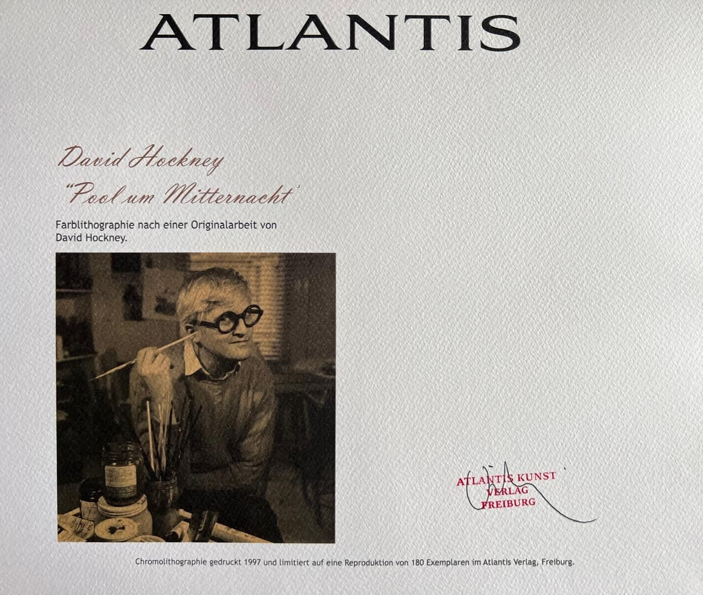 David Hockney Lithograph 'Midnight' COA Signed (Hand Numbered Limited Edition) David Hockney " Pool at midnight " Chromolithography printed in 1997 in 180 specimens by Atlantis Verlag, Freiburg 32 x 35 cm Signature David Hockney on the slab Dry and authentic stamp of the publishing house The progressive number could be different from the published one. Atlantis Kunst Verlag Freiburg David Hockney "Pool at midnight" Chromolithography printed in 1997 in 180 specimens by Atlantis Verlag, Freiburg 32 x 35 cm Signature David Hockney on the slab Dry and authentic stamp of the publishing house The progressive number could be different from the published one. Atlantis Kunst Verlag Freiburg