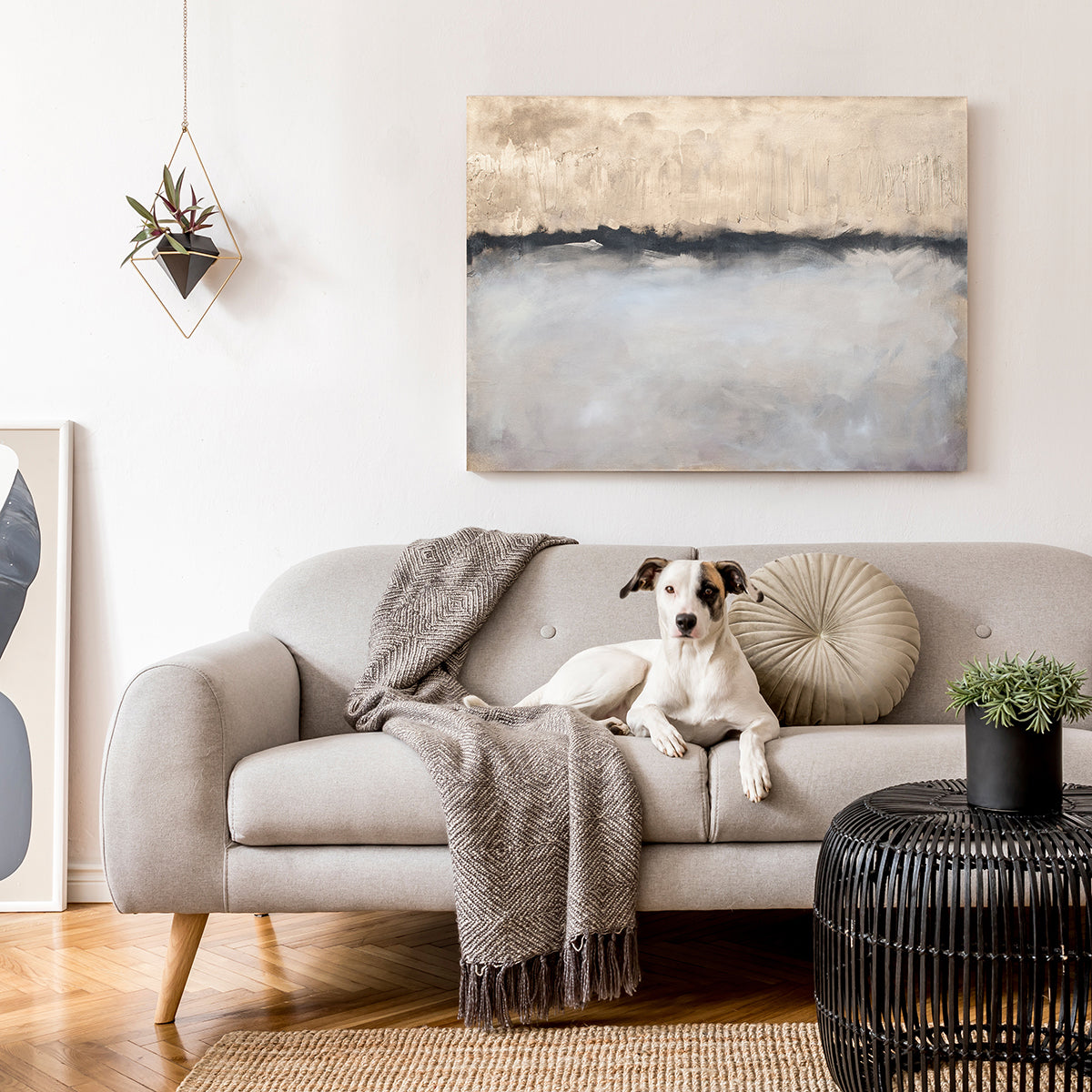 Drift away into this dreamy landscape filled with light and air. A soft,glowingpalette ofwarm neutral tones compositionally ground with the suggestion of a horizon.