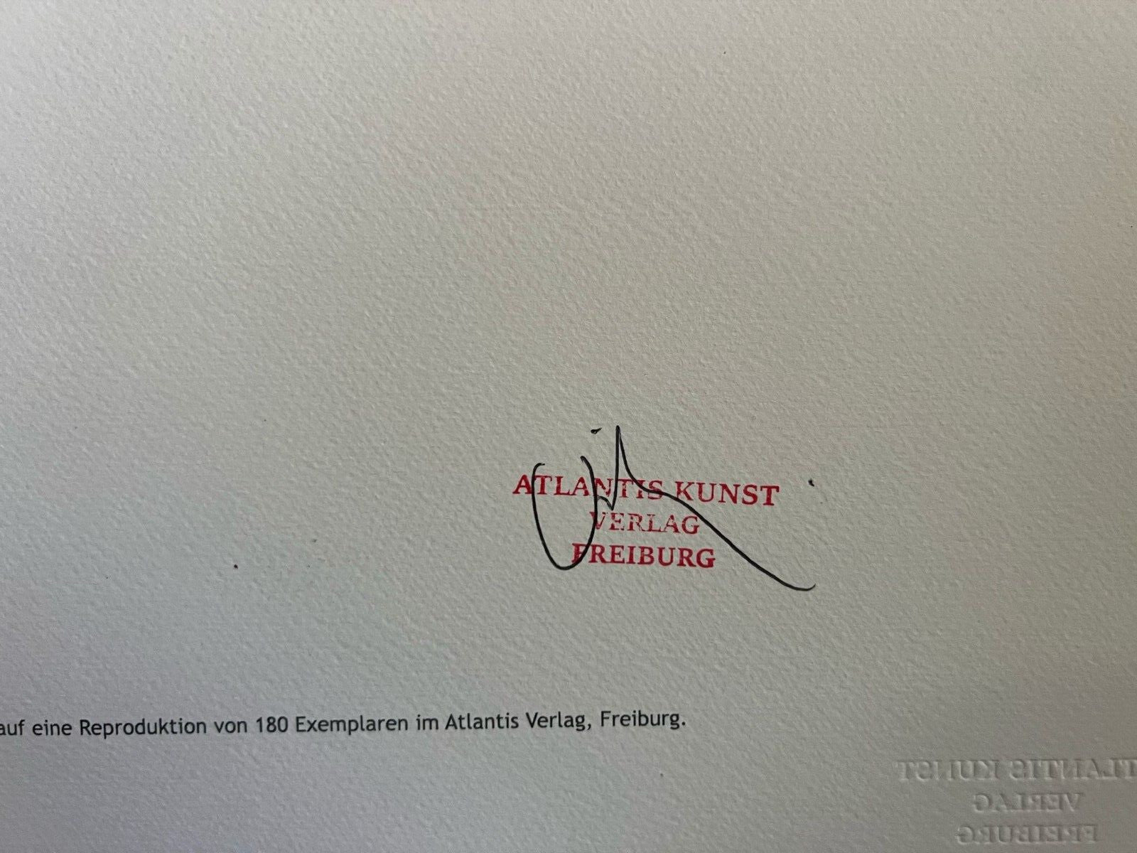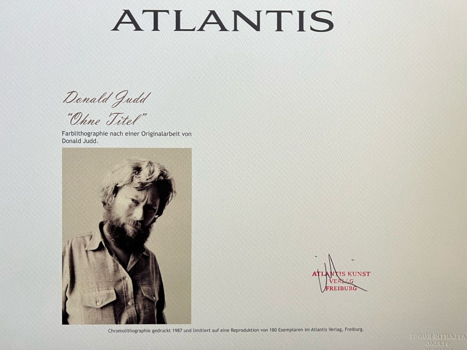Donald Judd Lithograph Signed COA Numbered Stamped (180 Ex) Donald Judd " without title " Chromolithography printed in 1987 in 180 specimens by Atlantis Verlag, Freiburg 31 x 40 cm Signature Donald Judd on the COA slab signed in Penna Dry and authentic stamp of the publishing house Atlantis Kunst Verlag Freiburg Donald Judd "without title" Chromolithography printed in 1987 in 180 specimens by Atlantis Verlag, Freiburg 31 x 40 cm Signature Donald Judd on the COA slab signed in Penna Dry and authentic stamp of the publishing house Atlantis Kunst Verlag Freiburg