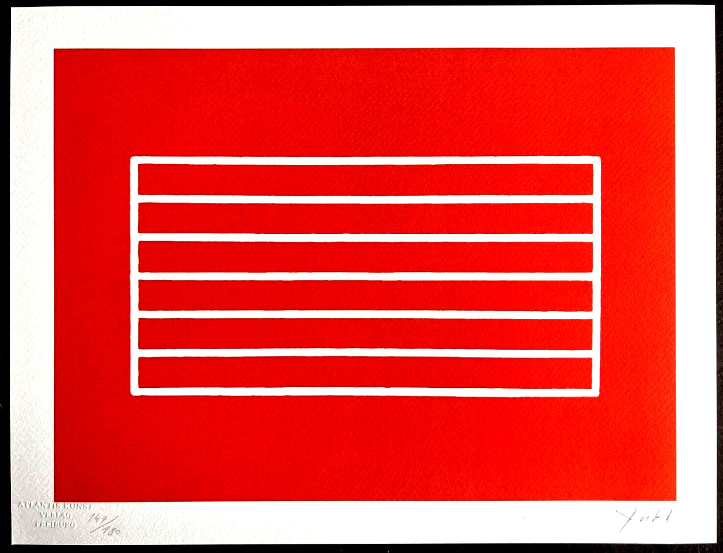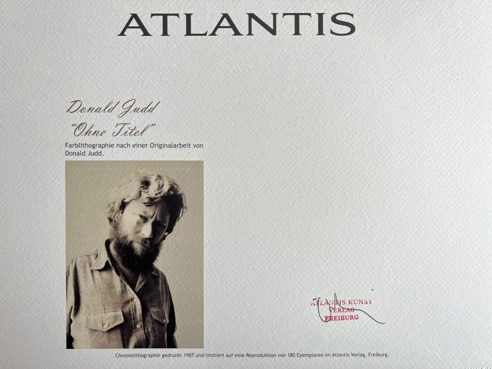 Donald Judd Lithograph COA Signed Op Numbered Stamped 180 Exe Donald Judd " without title " Chromolithography printed in 1987 in 180 specimens by Atlantis Verlag, Freiburg 32 x 42 cm Signature Donald Judd on the COA slab signed in Penna and stamped Dry and authentic stamp of the publishing house Atlantis Kunst Verlag Freiburg Donald Judd "without title" Chromolithography printed in 1987 in 180 specimens by Atlantis Verlag, Freiburg 32 x 42 cm Signature Donald Judd on the COA slab signed in Penna and stamped Dry and authentic stamp of the publishing house Atlantis Kunst Verlag Freiburg