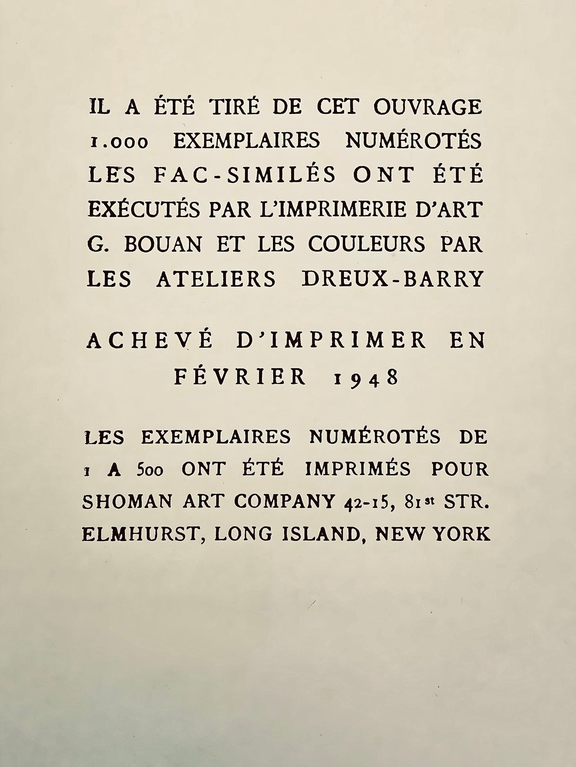 Bouan and colours by les ateliers Dreux-Barry finished printing in February 1948. The numbered copies of I a D have been printed for Shoman Art Company, Elmhurst, Long Island, New York.