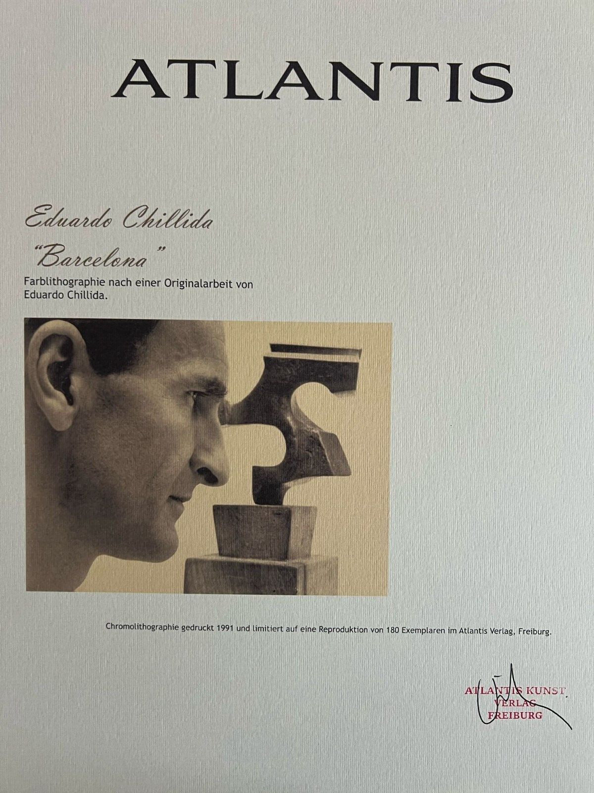 Eduardo Chillida Lithograph COA Signed Numbered By Hand 180 Exe Eduardo Chillida '' Barcelona " Chromolithography printed in 1991 in 180 specimens by Atlantis Verlag, Freiburg 33 x 45 cm Signature Eduardo Chillida on the slab Dry and authentic stamp of the publishing house Atlantis Kunst Verlag Freiburg Eduardo Chillida '' Barcelona " Chromolithography printed in 1991 in 180 specimens by Atlantis Verlag, Freiburg 33 x 45 cm Signature Eduardo Chillida on the slab Dry and authentic stamp of the publishing house Atlantis Kunst Verlag Freiburg