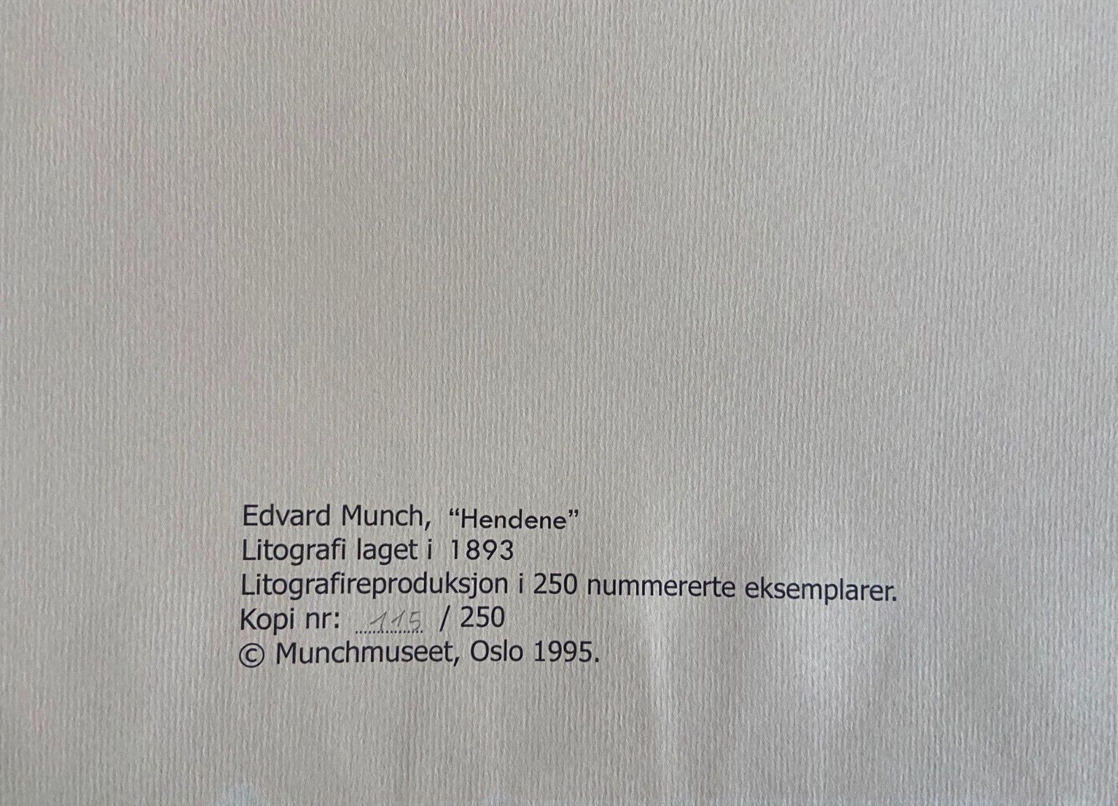 Edvard Munch Museum Lithograph Coa Signed Numbered Egon Schiele Edvard Munch '' The hands '' It operates by an design of the master of 1893. Signature Edvard Munch on the slab. The graphic work measures 30 x 41 cm The edition is 250 eg. hand numbered. Printed in 1995. Munch Museum , Oslo. Like Edgar Degas, Egon Schiele, Piet Mondrian, Georges Braque, Raoul Dufy, Ren Magritte, Edvard Munch, Gustav Klimt, Paul Cezanne, Renoir, Rembrandt, Picasso, Amedeo Modigliani, Constantin Brancusi , Paul Gauguin, Georges Seurat, Henri De Toulouse-Lautrec , Vassily. Kandinsky, Henri Matisse was one of the greatest artists of the twentieth century. Edvard Munch '' The hands '' It operates by an design of the master of 1893. Signature Edvard Munch on the slab. The graphic work measures 30 x 41 cm The edition is 250 eg. hand numbered. Printed in 1995. MunchMuseum, Oslo. Like Edgar Degas, Egon Schiele, Piet Mondrian, Georges Braque, Raoul Dufy, Ren Magritte, Edvard Munch, Gustav Klimt, Paul Cezanne, Renoir, Rembrandt, Picasso, Amedeo Modigliani, Constantin Brancusi , Paul Gauguin, Georges Seurat, Henri De Toulouse-Lautrec , Vassily. Kandinsky, Henri Matisse was one of the greatest artists of the twentieth century.
